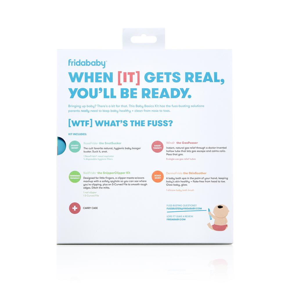 What's Inside? 1 NoseFrida & 4 Hygiene Filters, 5 Windi the GassPasser tubes, 1 NailFrida the SnipperClipper Set, 1 DermaFrida the SkinSoother, 1 Keep-It-All-In-One-Case Zippered Pouch