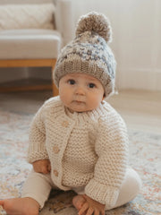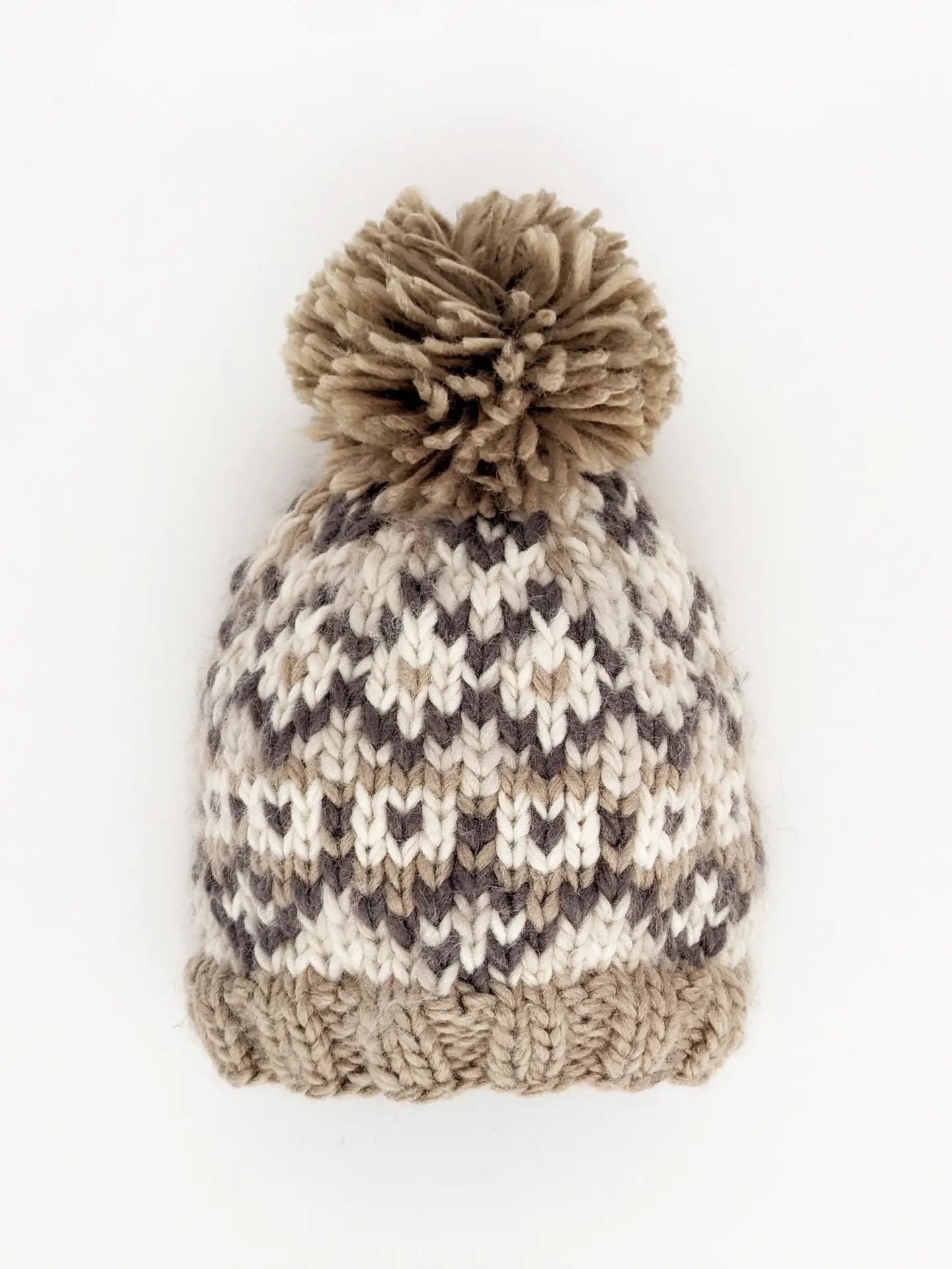 Knit in soft, chunky yarn, this hat has an intricate pattern in Pebble, Oatmeal, Natural and Grey yarn and topped with a pom pom. Each hat is partially knit from recycled, sustainable Polyester yarn made from plastic bottles. We are on a mission to help reduce the world's plastic pollution problem ♻