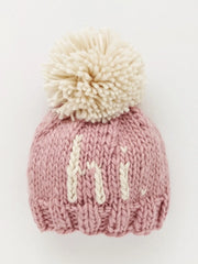 What a cute way to greet the world! This beanie is hand knit in cozy Rosy pink hued yarn with the word 'hi.' in natural colored yarn. Topped with a natural yarn pom pom, this looks great with everything and is a fun gender neutral baby gift.