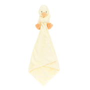 Sweet, gentle Bashful Duckling Soother is a perfect newborn gift, rolled up and presented in a Baby Jellycat grosgrain ribbon. Featuring our most loved farmyard friend, soft in a pale yellow fur made from recycled fibers and holding on tight to a smooth, un-stuffed square shaped soother; a simply gorgeous cuddle companion.