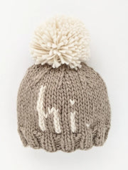 What a cute way to greet the world! This beanie is hand knit in cozy Pebble Brown hued yarn with the word 'hi.' in natural colored yarn. Topped with a natural yarn pom pom, this looks great with everything and is a fun gender neutral baby gift.
