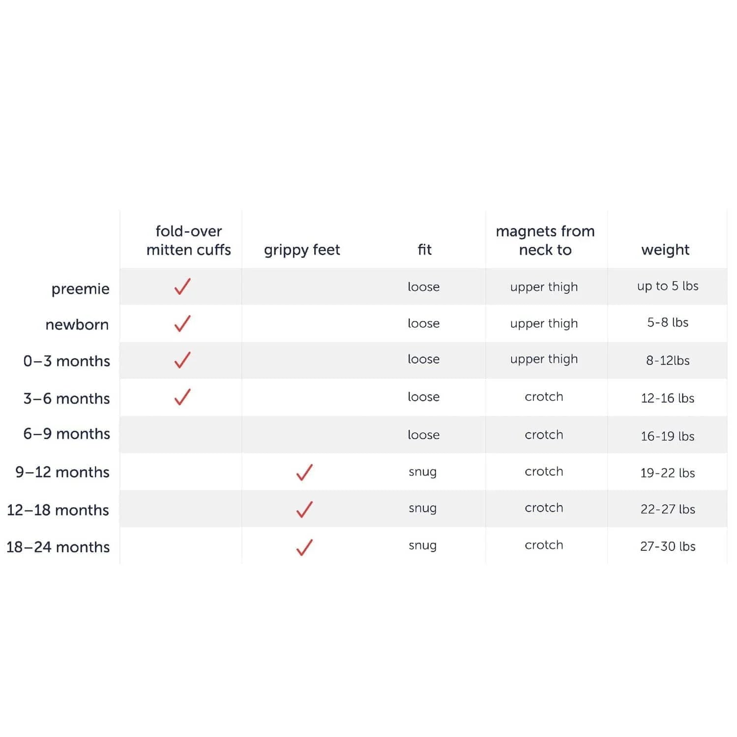 - magnetic closures: magnets line the seam from the neck to upper thigh for sizes up to 0-3m & from neck to crotch for sizes 3-6m and up.