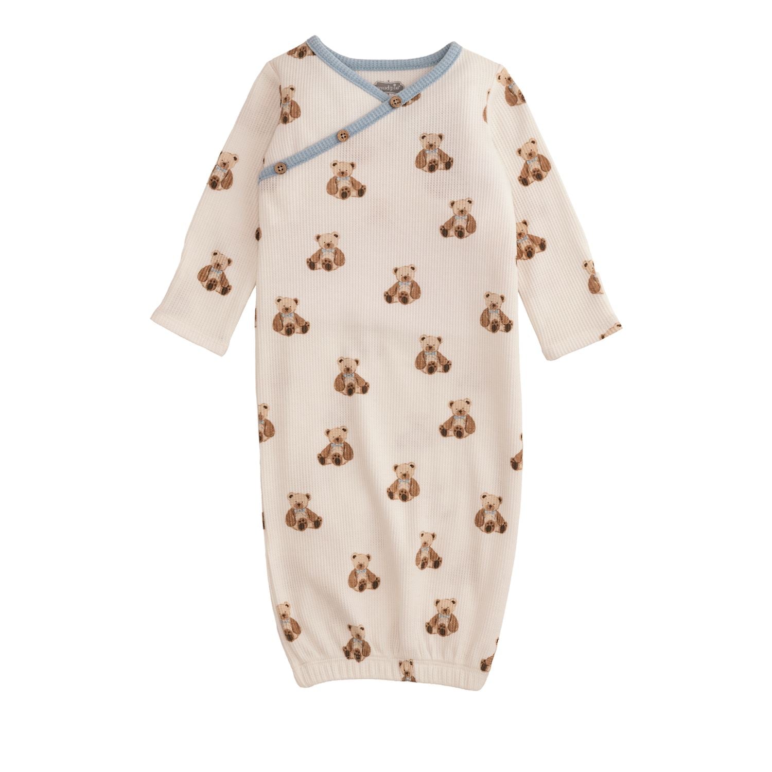 The Teddy Bear Baby Sleeper Gown is a cozy and adorable choice for your little one. Crafted from a soft waffle weave fabric, this gown offers a gentle touch against your baby's delicate skin. The long sleeves provide warmth and comfort, making it perfect for cooler nights. Featuring a charming coconut wood button chest placket, this gown adds a touch of natural elegance. Designed for babies aged 0-3 months, it ensures a snug fit while allowing for easy movement. The blend of 57% cotton, 41% polyester, and 2% spandex ensures durability, breathability, and a slight stretch for added comfort. Ideal for bedtime or lounging, this sleeper gown combines style and practicality for your baby's wardrobe.
