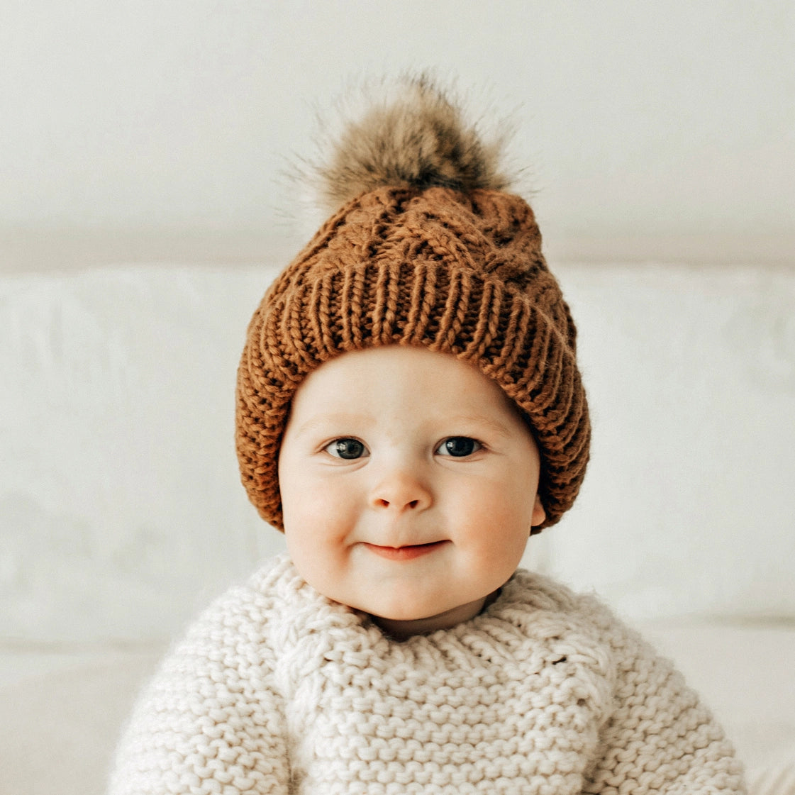 Super cozy hat hand-knit in Pecan brown hued Icelandic yarn is topped with a furry pom. This is a great cold weather hat and is perfect for gift giving. It makes a fun photo prop too. We offer this in other colors as well. • 100% Acrylic • Cold handwash • Hand knit in China