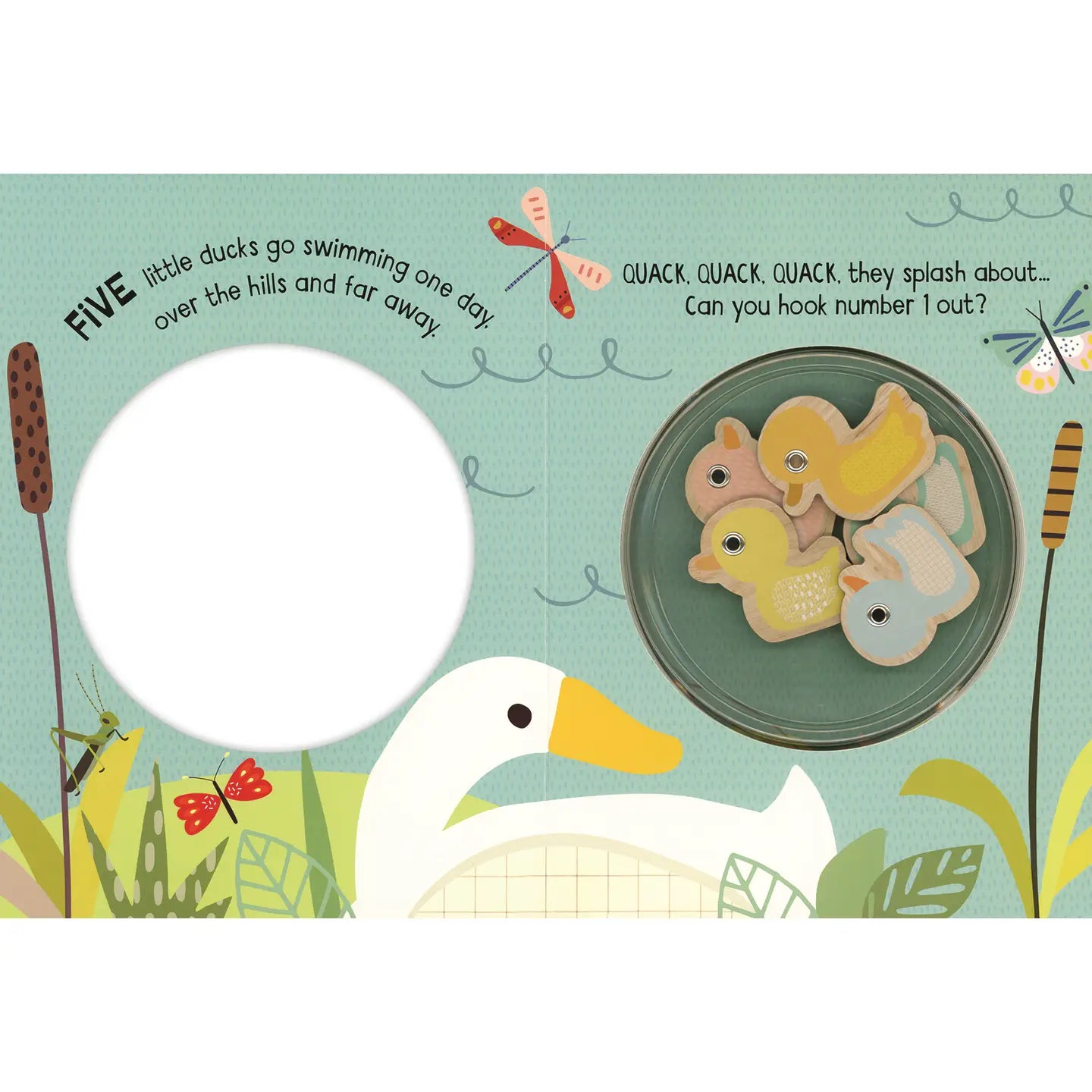 Spot which colorful duck to catch next! Hook out the numbered ducks with the fishing rod in this splishy-splashy interactive book. Fishing by Numbers series: Each book comes with a rod for catching the magnetic creatures, helping to improve fine motor skills and hand-eye coordination as the child retrieves the numbered animals. Board book. 12 Pages. Ages 3 and up.