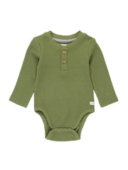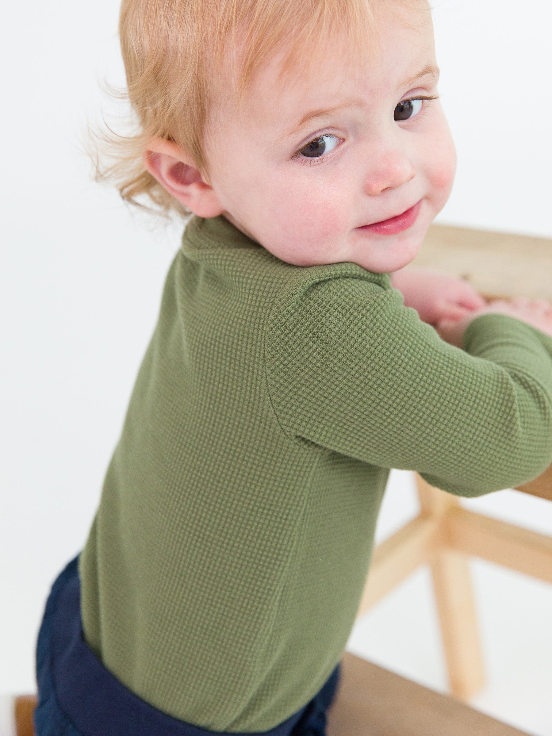 Dress him in comfort and style with our Boys Waffle Knit Henley Bodysuit. Crafted from soft, breathable waffle knit fabric, this bodysuit features a classic henley design with a button placket for easy dressing. Perfect for layering or wearing solo, it offers both warmth and a trendy, laid-back look. Ideal for active days and cozy nights.