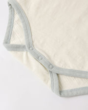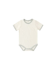Short sleeved onepiece in our velvety soft brushed jersey knit with contrast ribbing and snaps at the shoulder and bottom for easy changes.