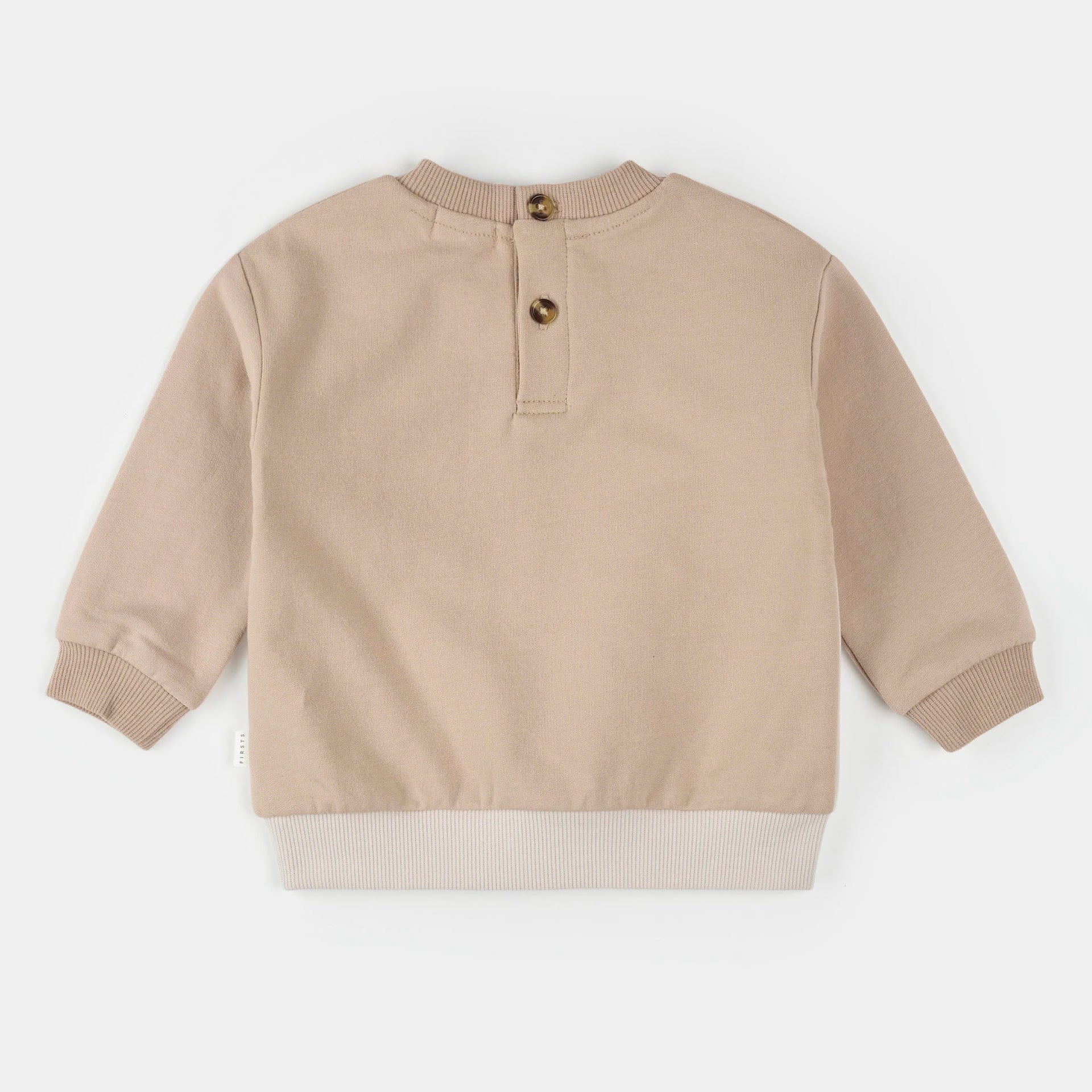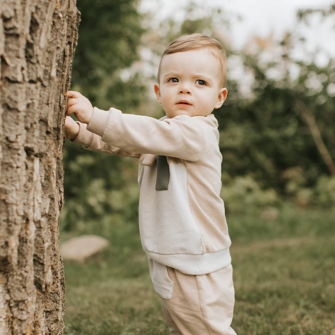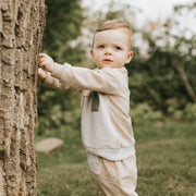 Cozy and versatile, this fleece set is perfect for everyday adventures. The crewneck top has a single green pocket to contrast from its neutral palette. The matching pants have a relaxed fit with a central pocket for tiny treasures and an easy-to-wear drawstring waistband. Layer over a bodysuit for extra warmth and a snug fit.