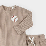 Keeping them at just the right temperature as they head to their first big game, this two-piece shorts set is made from a light and breathable thermal material with organically grown cotton. The long-sleeved top has upturned cuffs for a casual style and a button placket at the back for easy dressing. With an elasticated, drawstring waistband the shorts are easy to pull on or remove for quick changes.