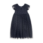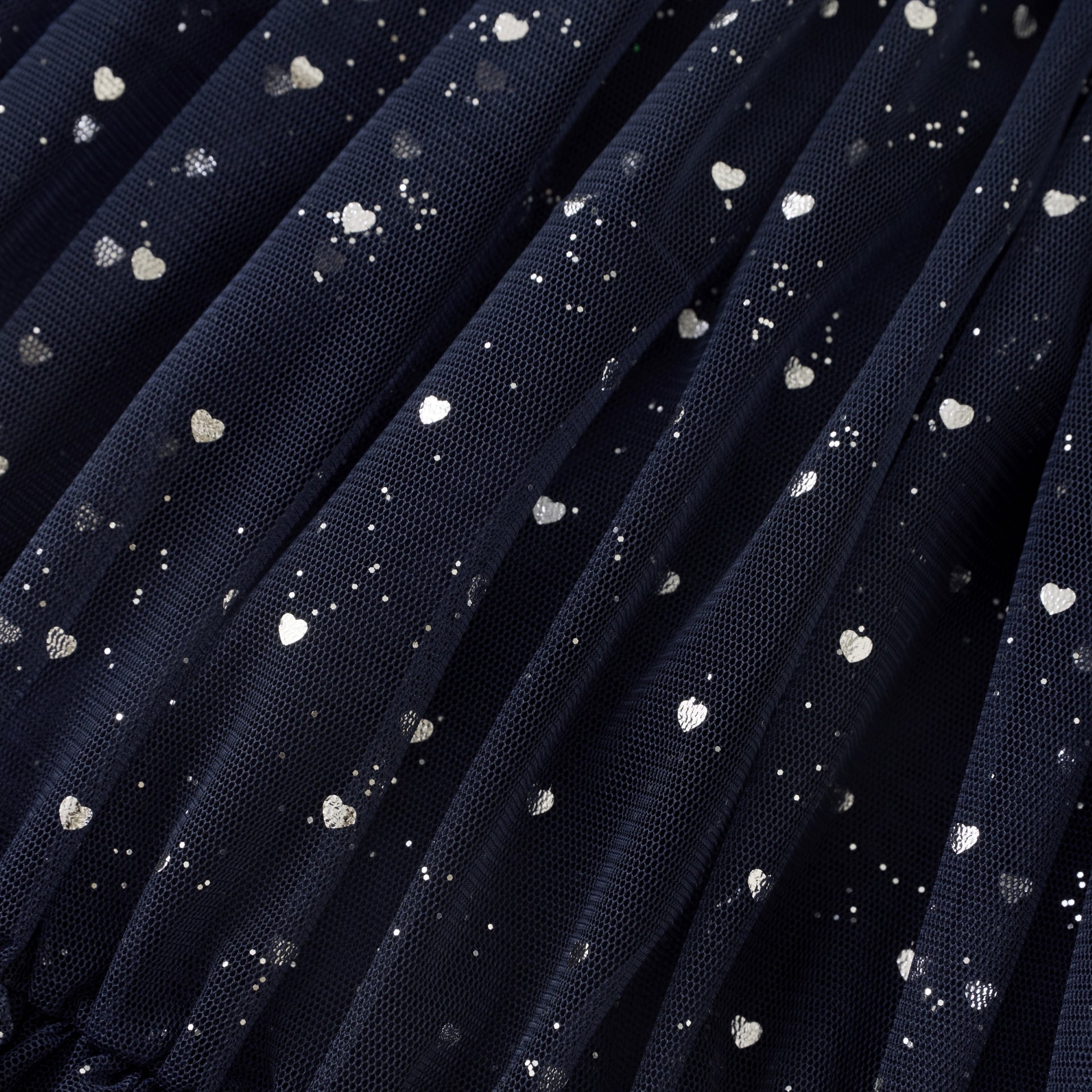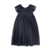 Navy tulle short sleeve dress with silver heart accents. Add a white sweater and some neutral tights to complete the outfit for the perfect Holiday dress.