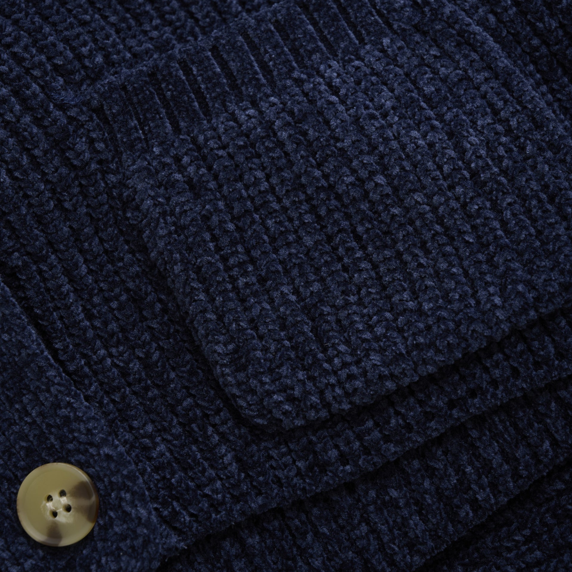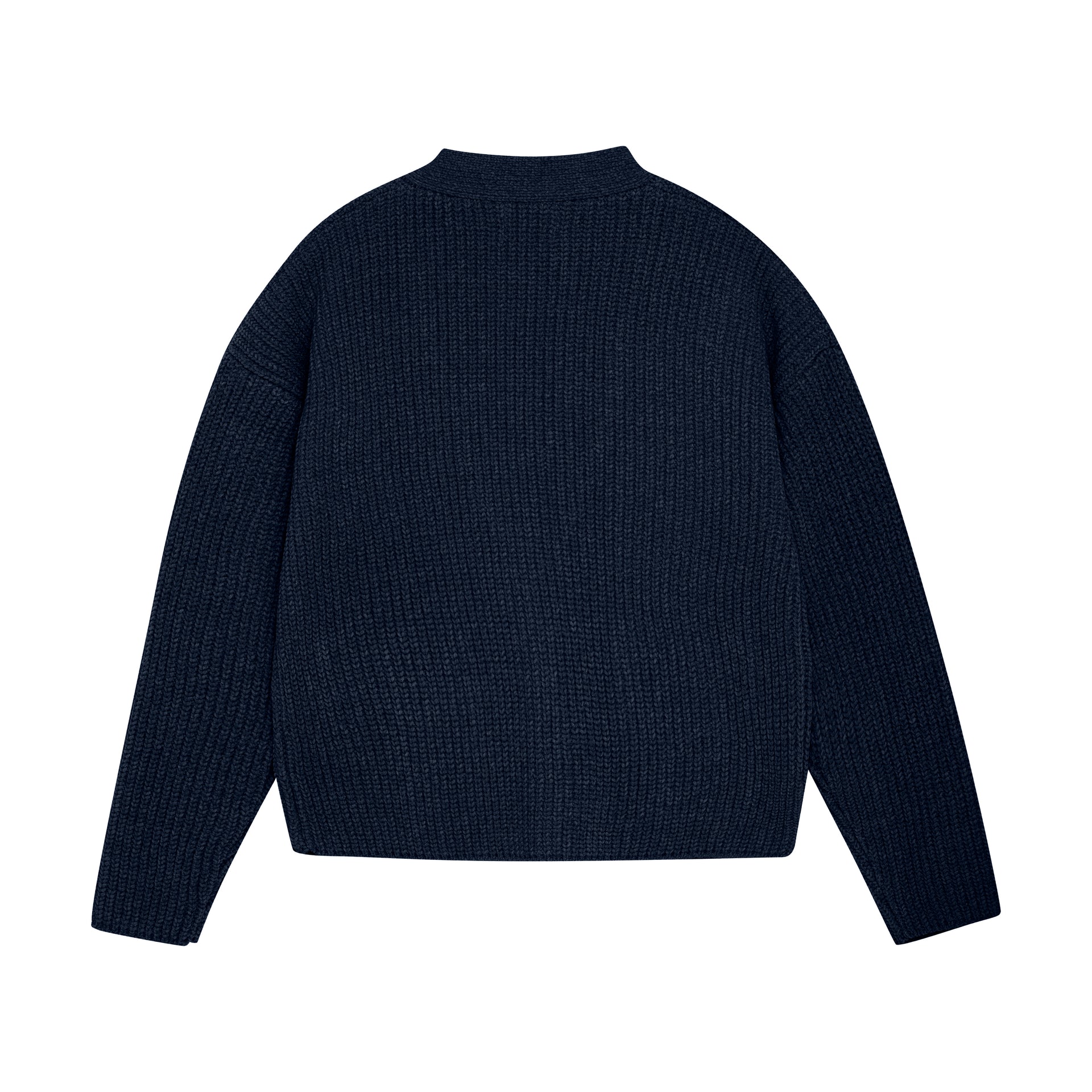 Dark navy v-neck cardigan with neutral colored buttons down the middle and two pockets. Perfect to layer over dresses and tees.