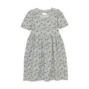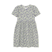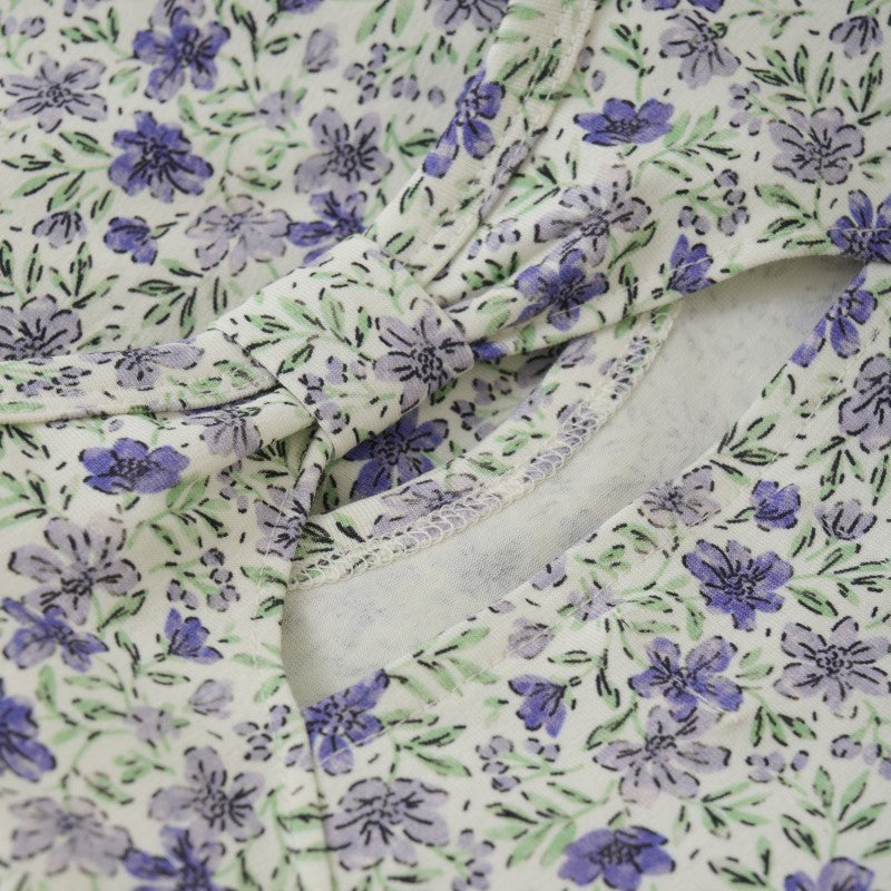 Short sleeve dress with a beautiful floral pattern consisting of lilacs and purples and pastel green. The back has a keyhole detail and there is slight gathering at the waist. The perfect dress for Easter, weddings, back to school, etc.