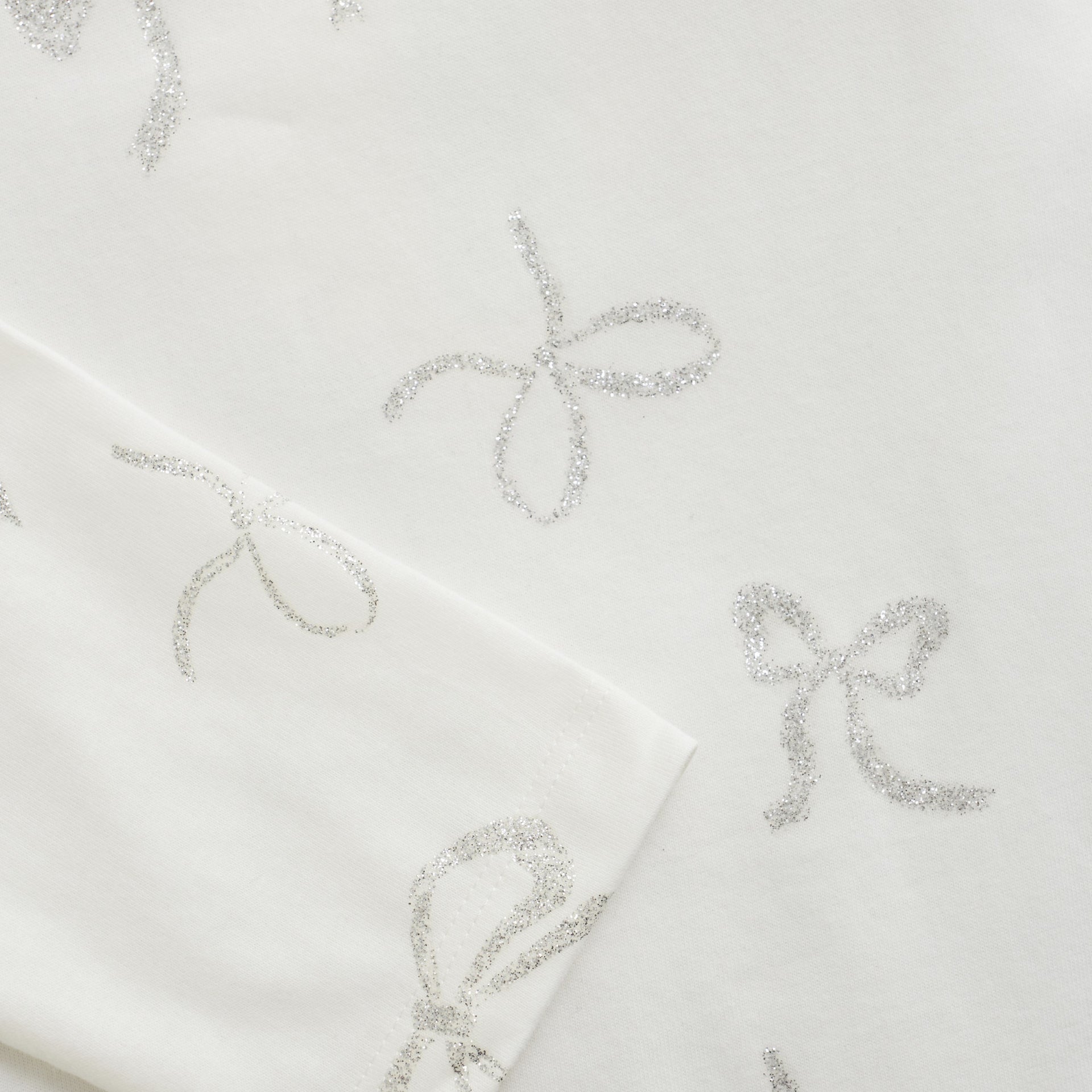 Long sleeve white tee with a silver glitter bow pattern. Perfect for the Holiday season or your bow obsessed little.