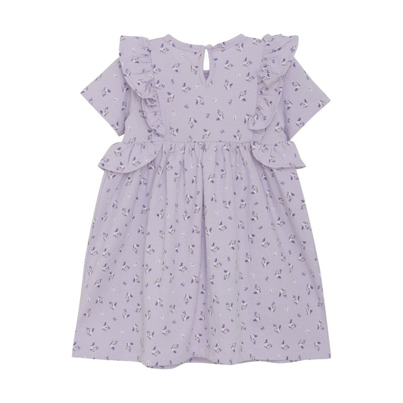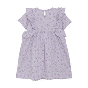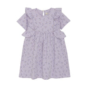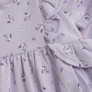 Orchid dress with a floral pattern including purples, cream and peach. This dress also includes textured fabric and ruffles on the bodice. The perfect dress for spring and summer.