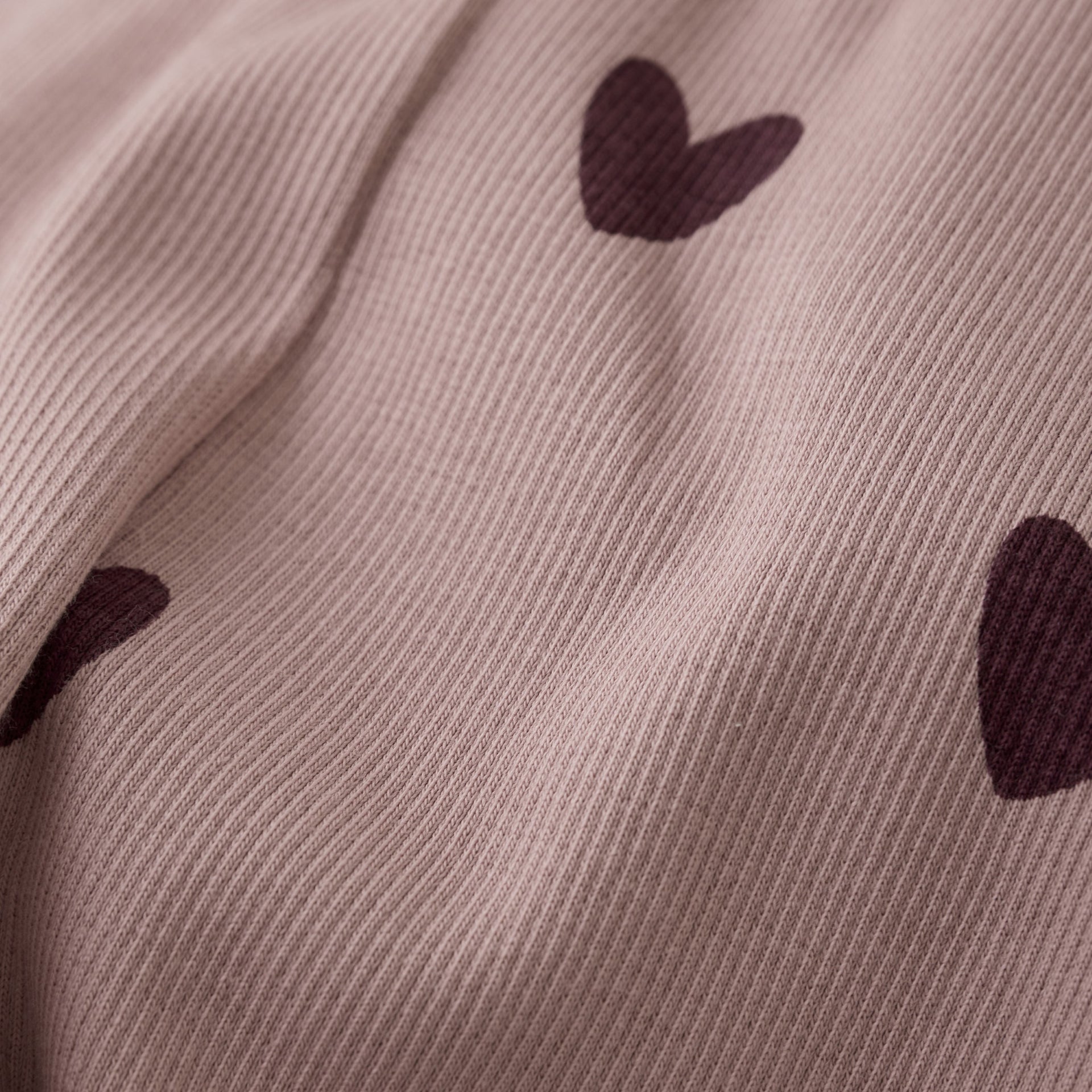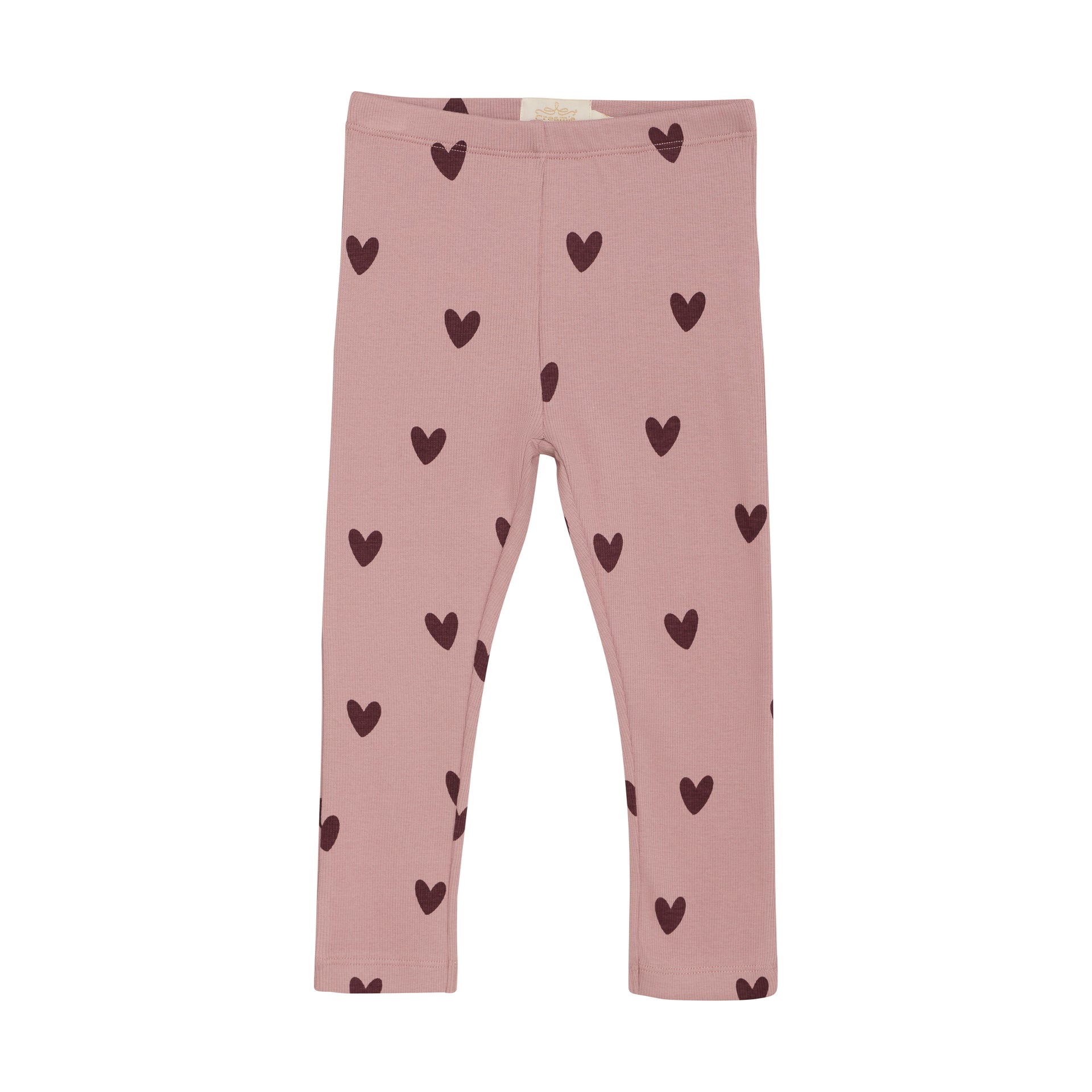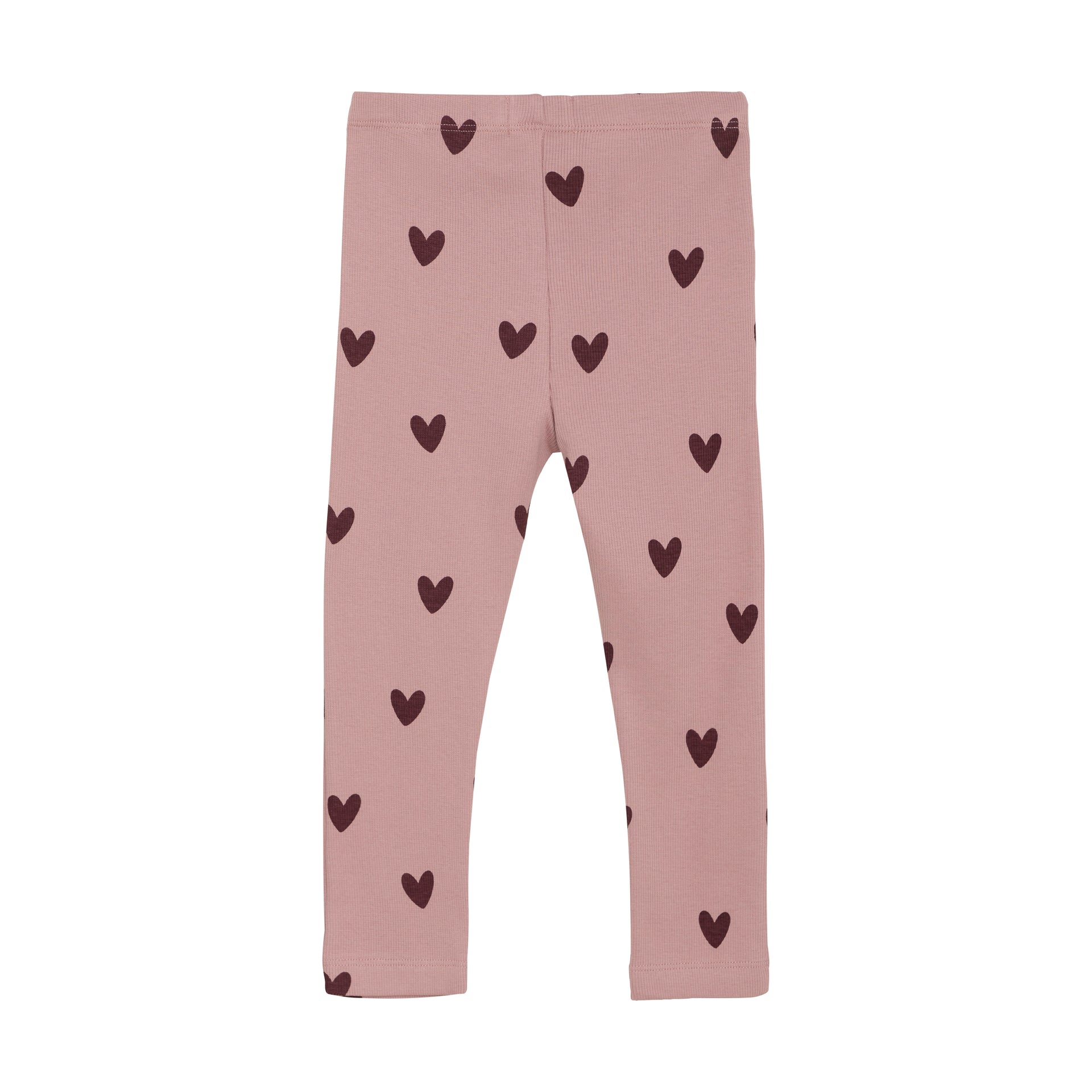 Light pink ribbed leggings with a burgundy heart pattern. Pair with the Vineyard Wine Long Sleeve Ruffle T-shirt for a complete outfit.