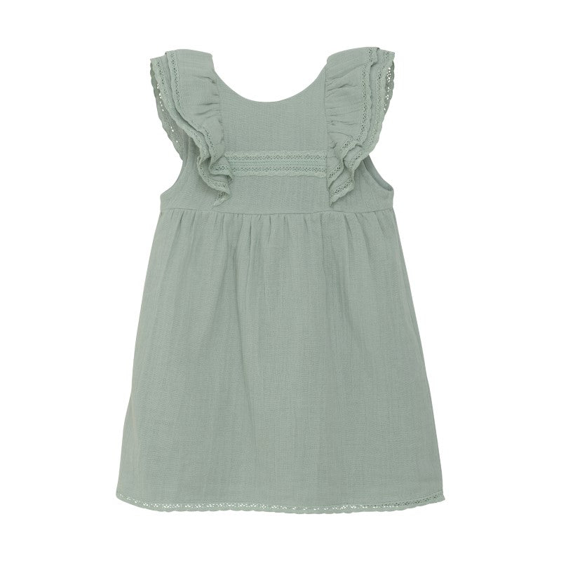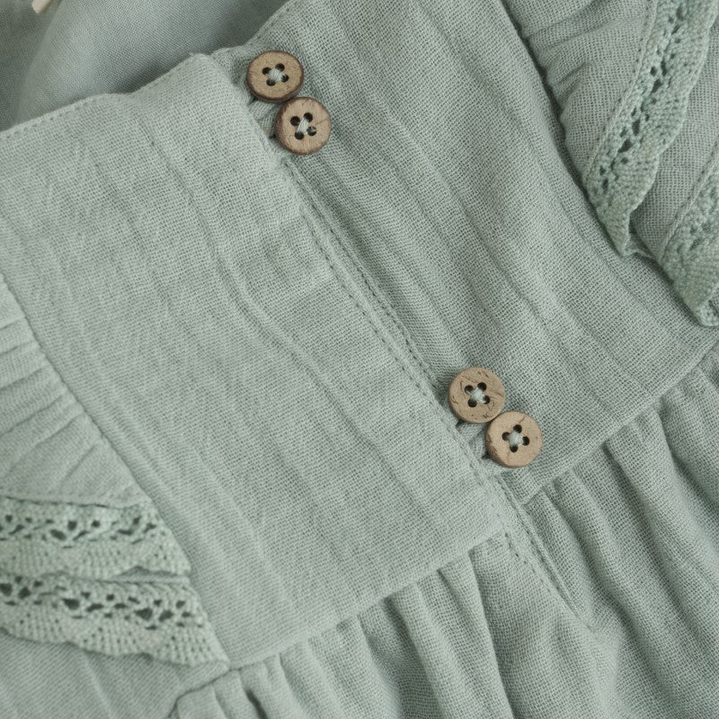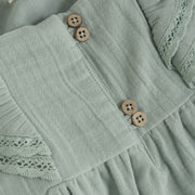 Sage green lightweight dress with flutter sleeves, wooden buttons on the bodice and a simple lace detailing on the bottom hem of the dress. The simplicity of this dress is perfect for any special events.