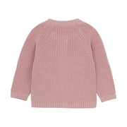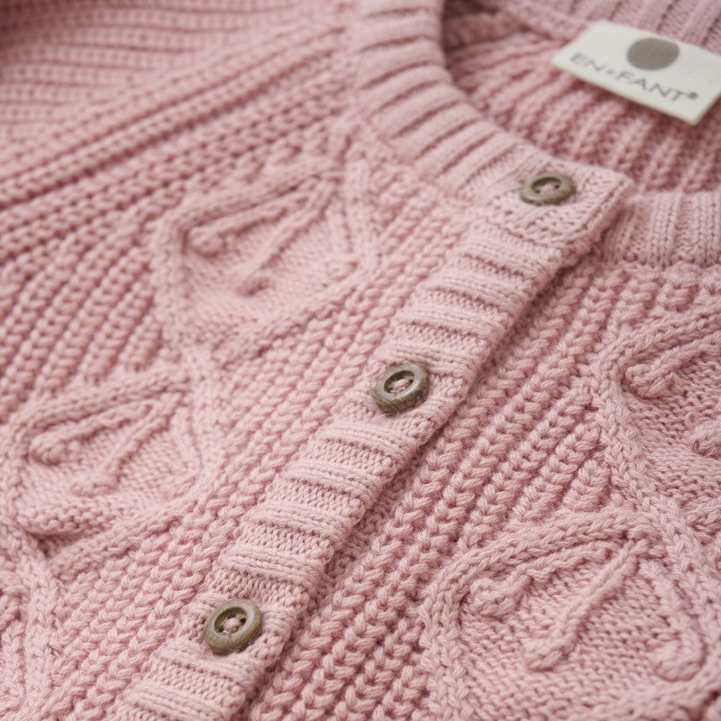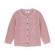 Rose knit cardigan with bobble-like texture and wooden buttons. The sweetest little cardigan to pair over any dresses or tees for cooler weather.