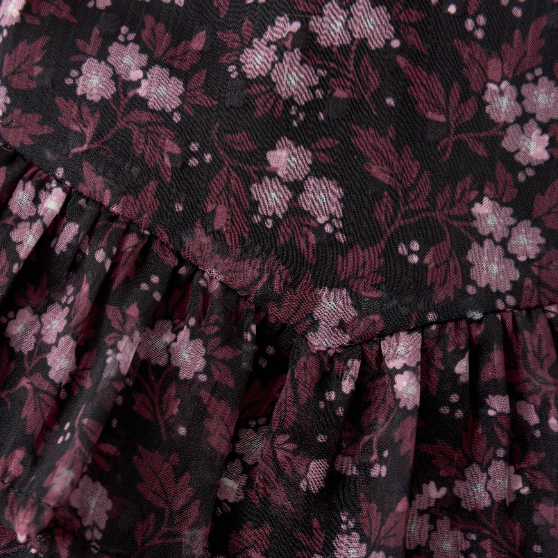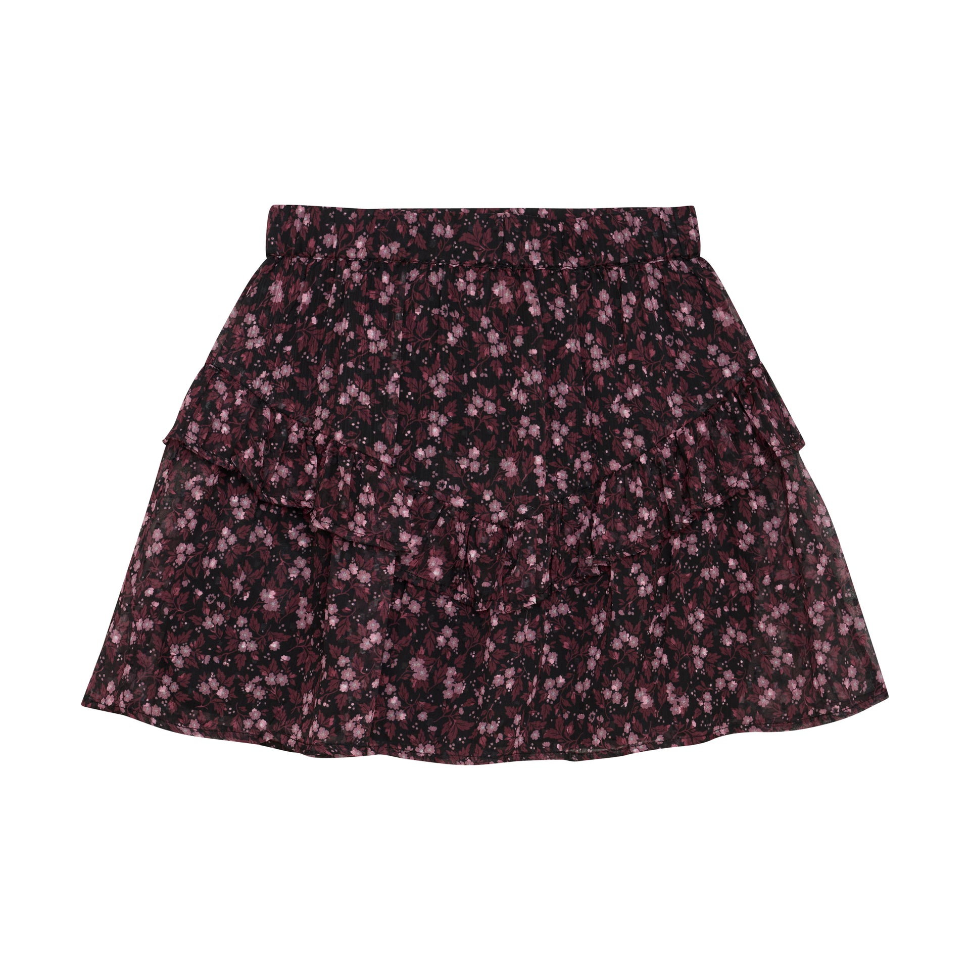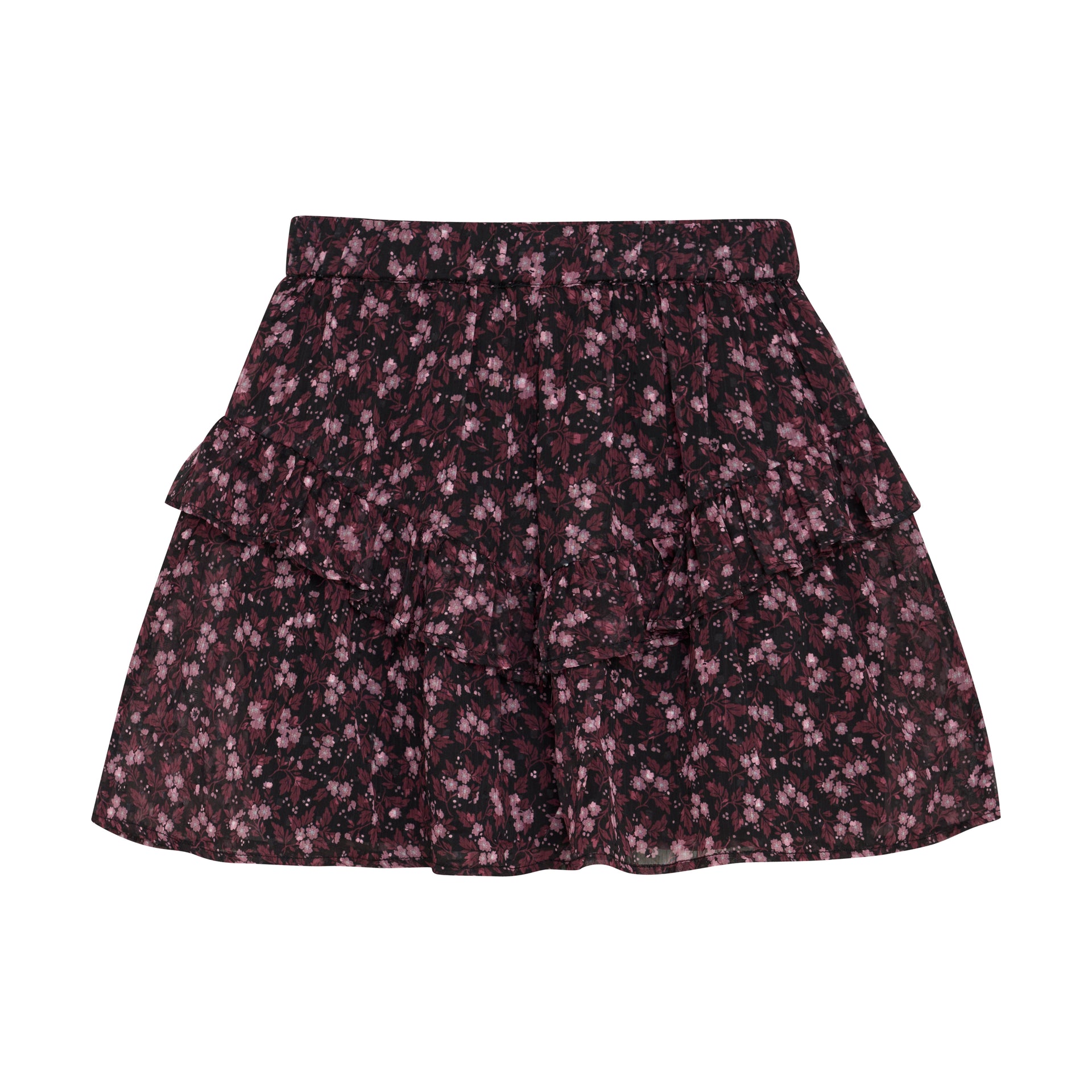 Black skirt with maroon & pink floral pattern. This skirt features a v shape of ruffles in the middle of the skirt. Add an oversized sweater and knit tights for the perfect fall outfit.