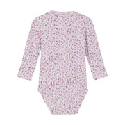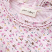 Blush ribbed bodysuit with watercolor florals and lace collar details around the neck.