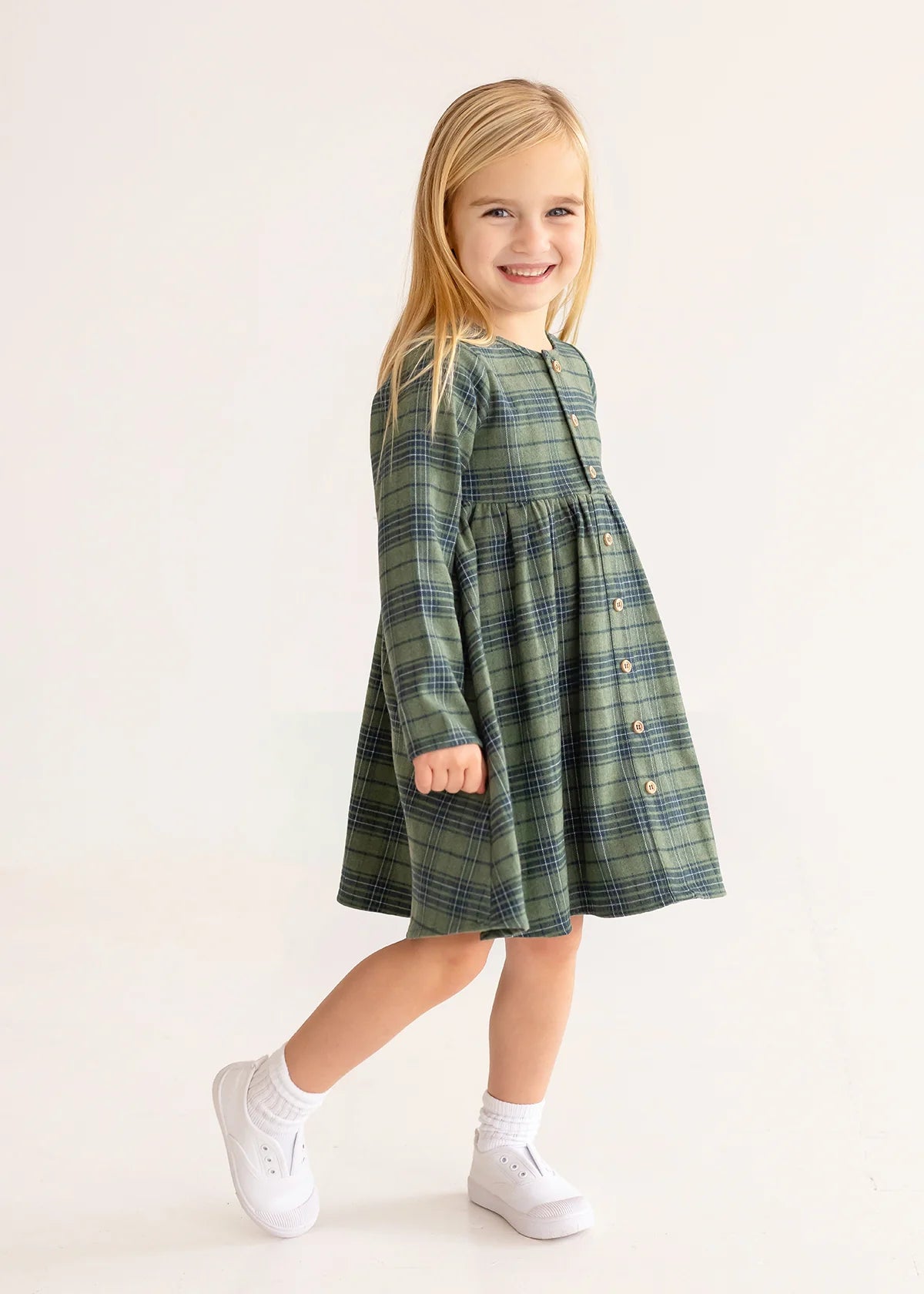 Bring the essence of autumn to your little one's wardrobe with the Cozy Creatures Dress. This charming long-sleeve dress features a classic green plaid pattern, complemented by warm wooden button details down the front.
