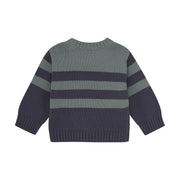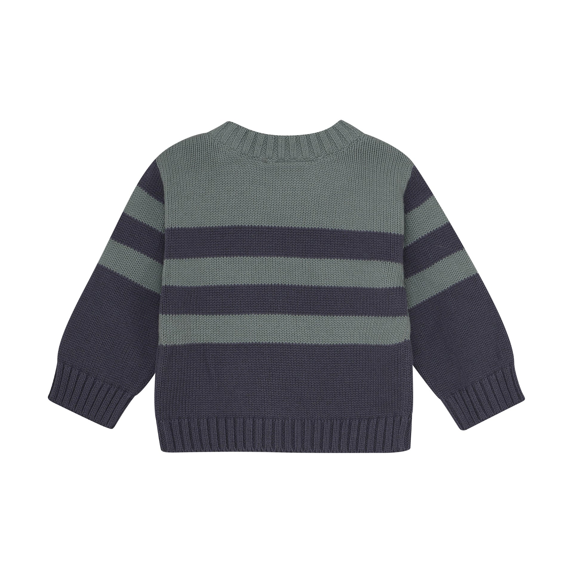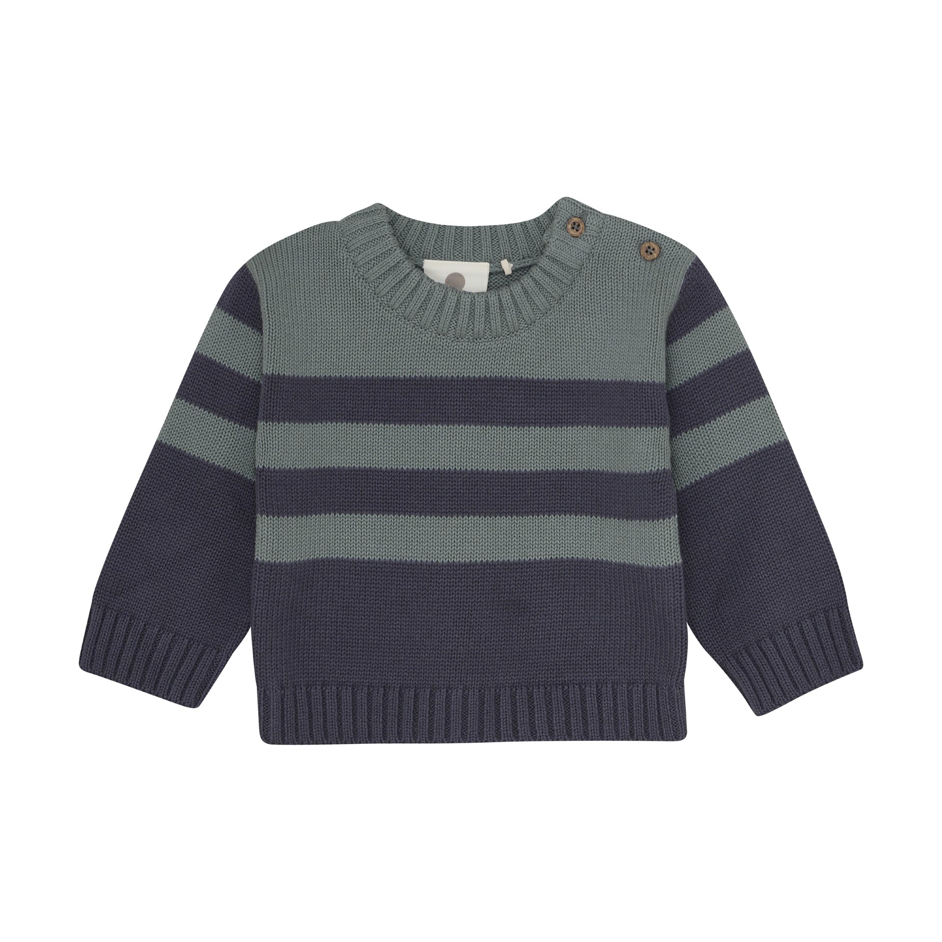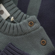 Charcoal & foresty teal striped sweater with brown button detailing on the shoulder for easy on & off.