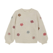 Sandshell sweater with multi-color embroidered flowers. Pair with denim for a chill look or our ribbed flare leggings in fuchsia or jadeite or a skirt to make a super fun outfit!