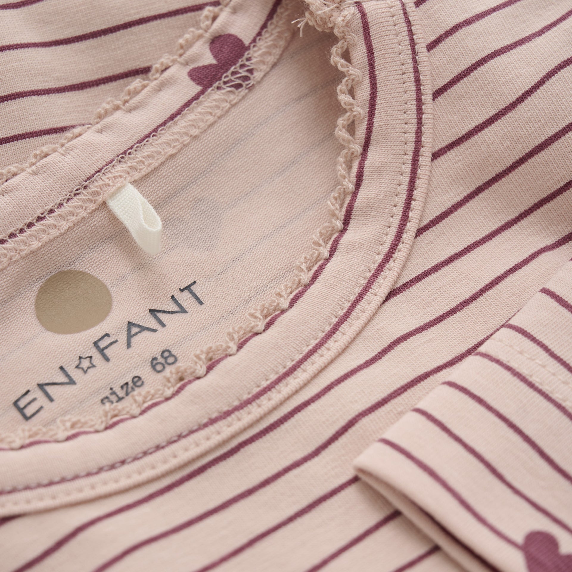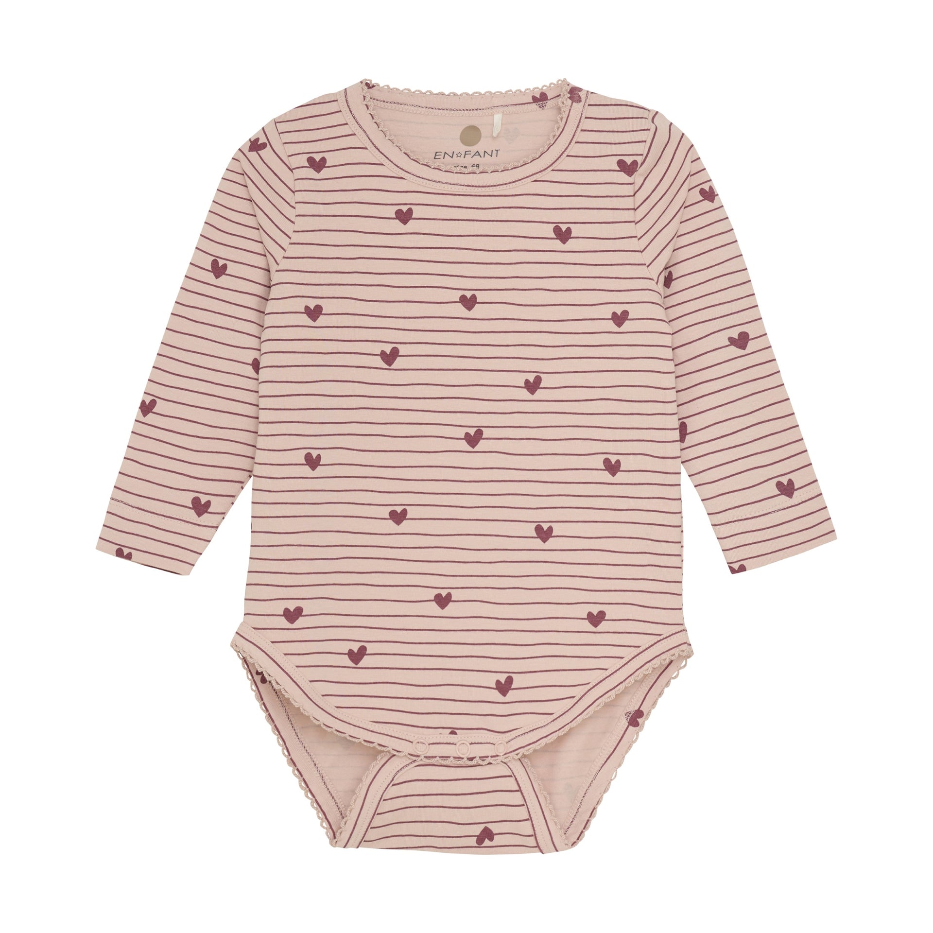 Light pink long sleeve bodysuit with a heart & stripe pattern, and a lace detailing around the neckline and bottom hem.