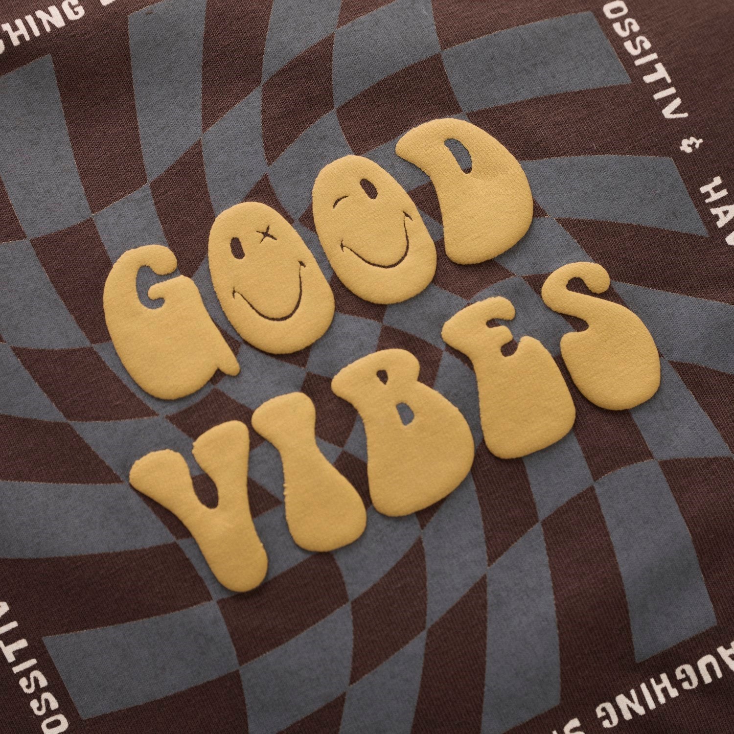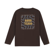 Brown graphic long sleeve with a simple smiley on the front and a fun graphic with inspirational words on the back.