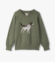 Olive green knitted sweater with a dog graphic. Perfect fall sweater to add some fun to your little ones wardrobe.