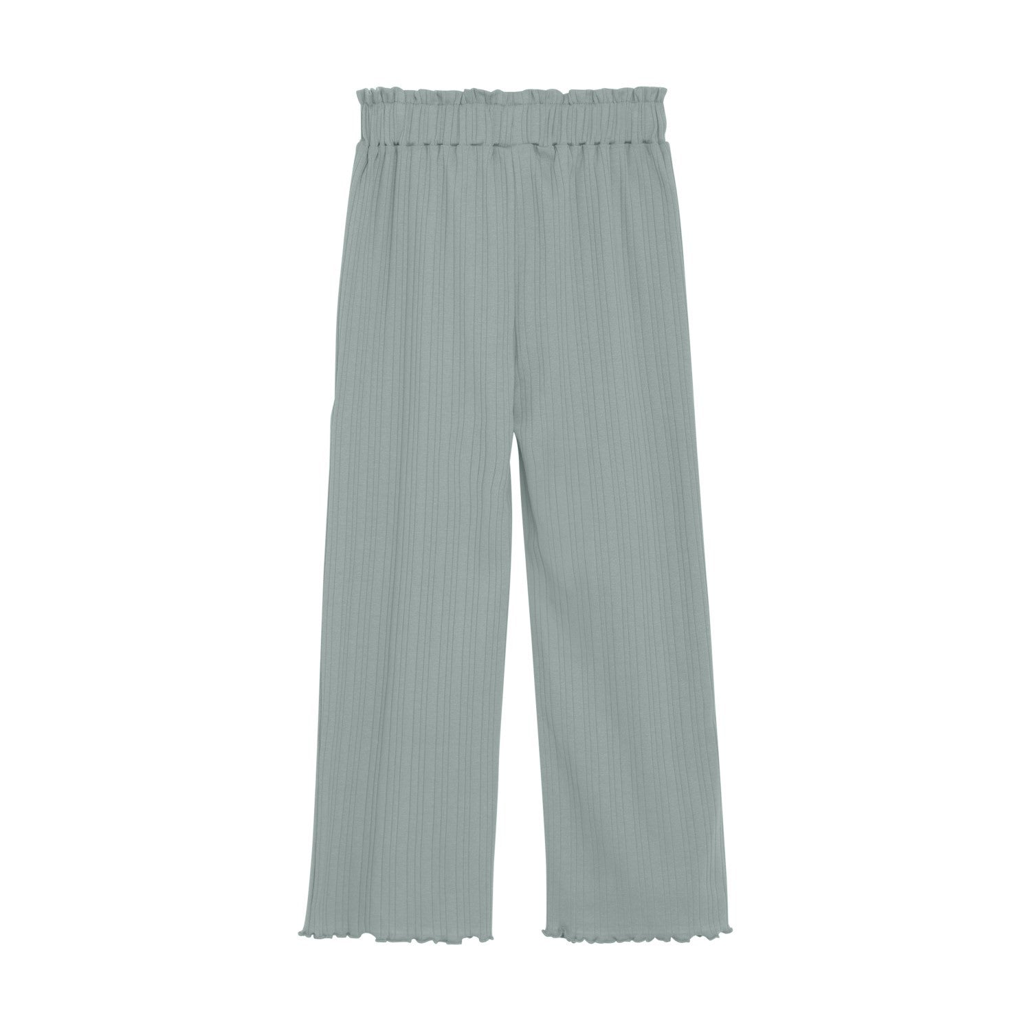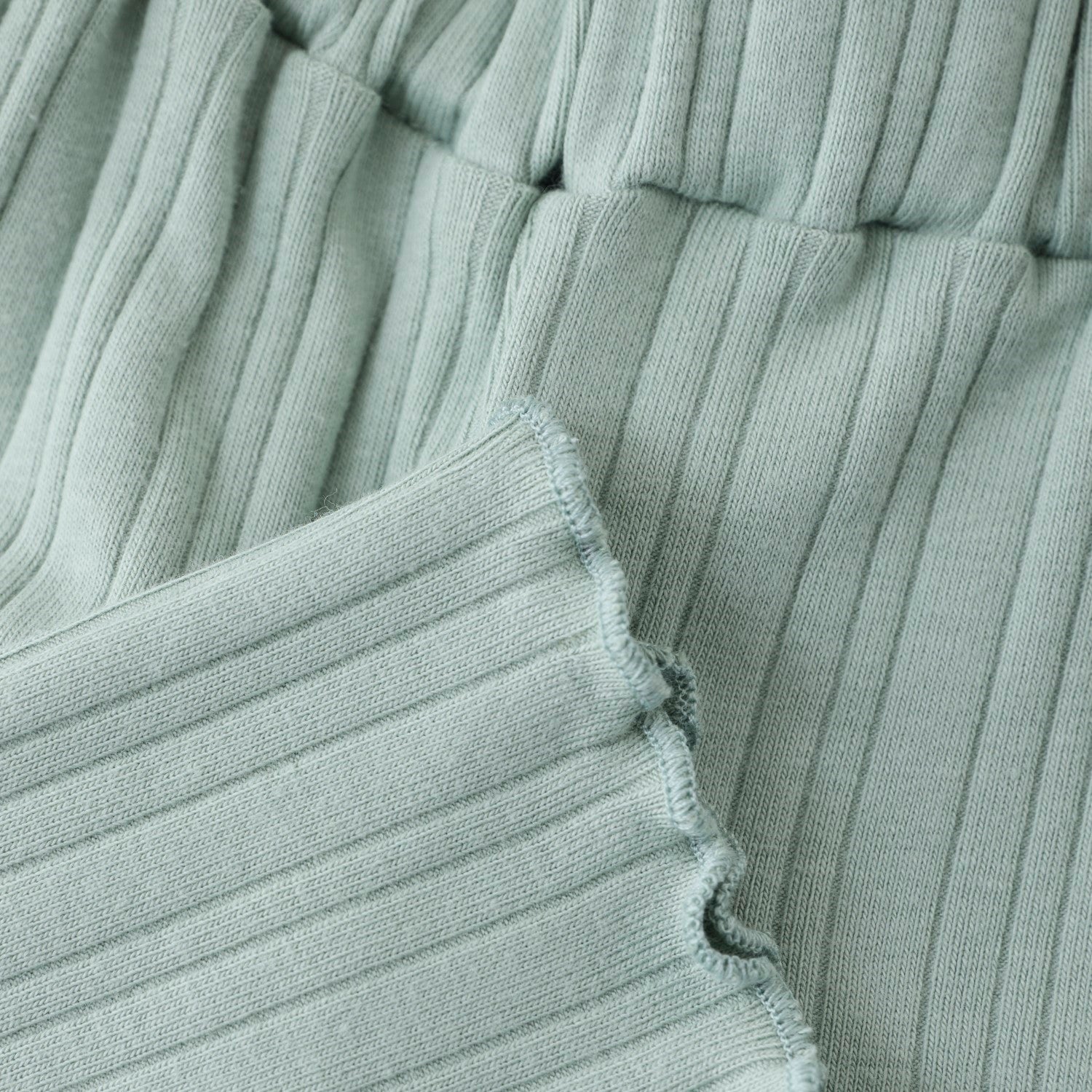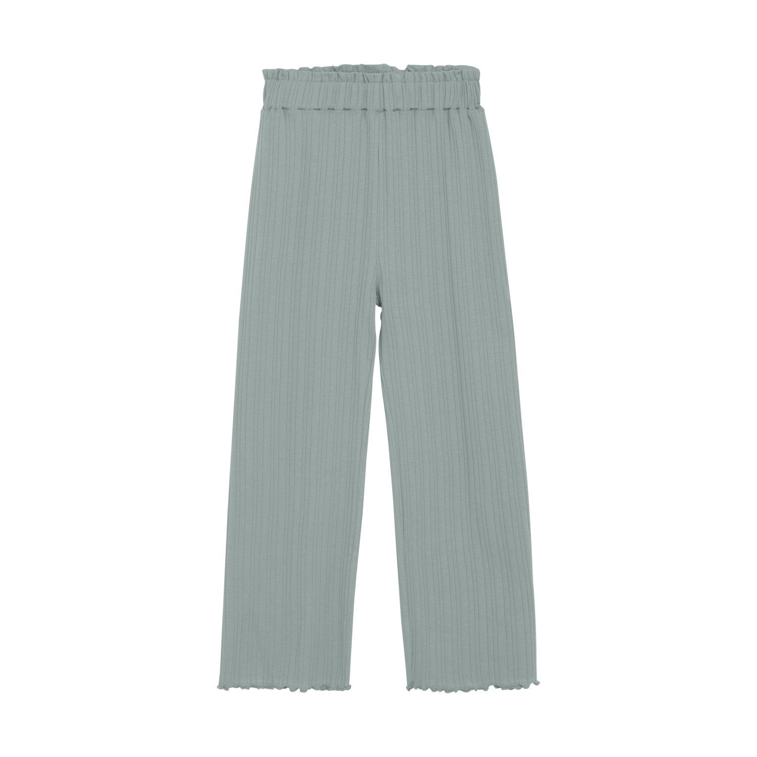Jadeite ribbed pant with a gathered waist. These bottoms will become a staple in your little ones wardrobe.