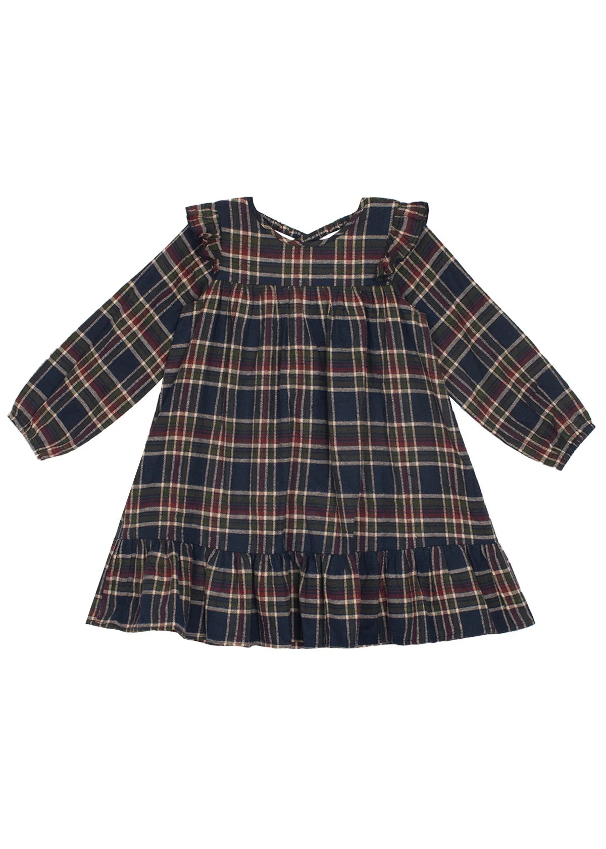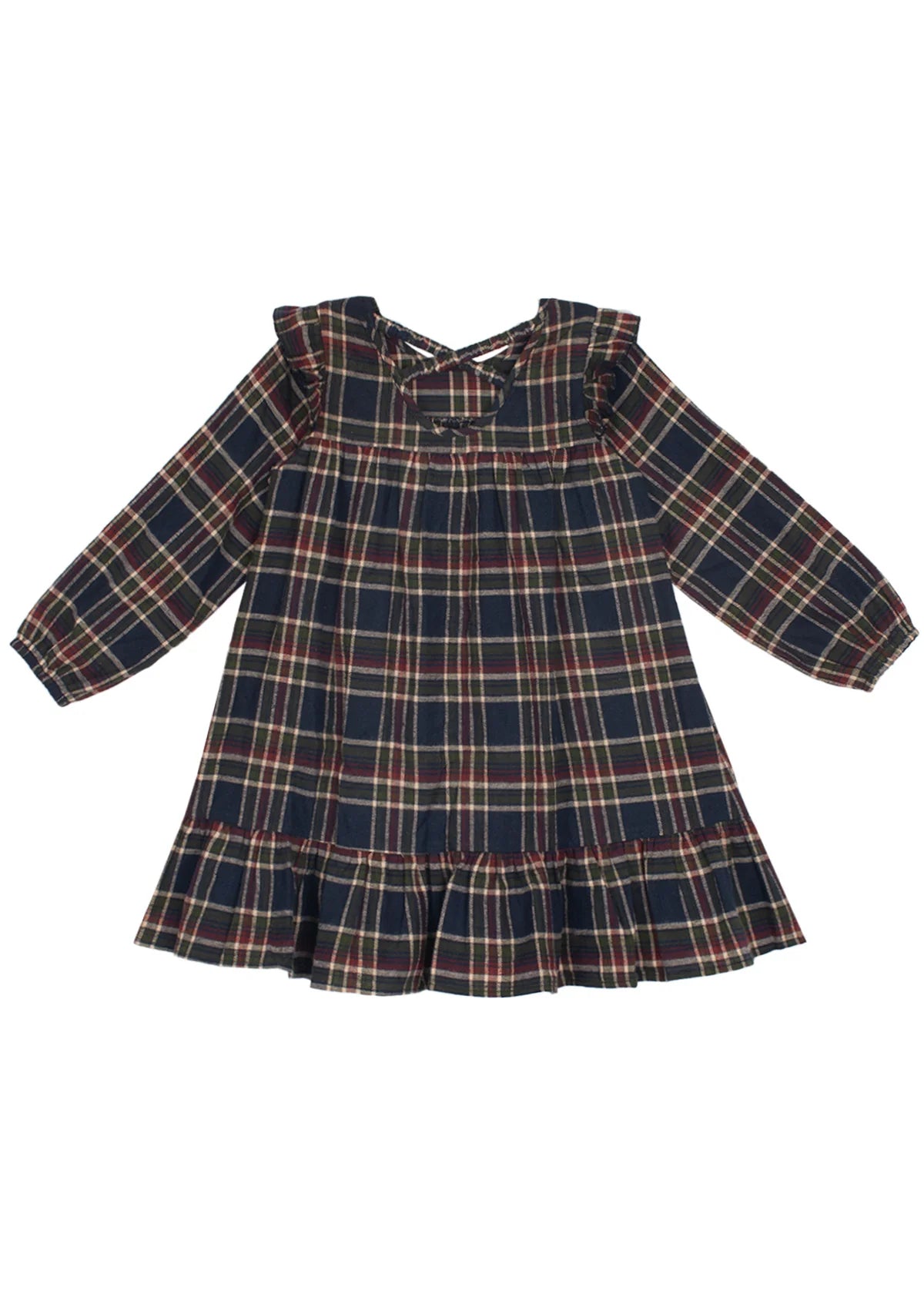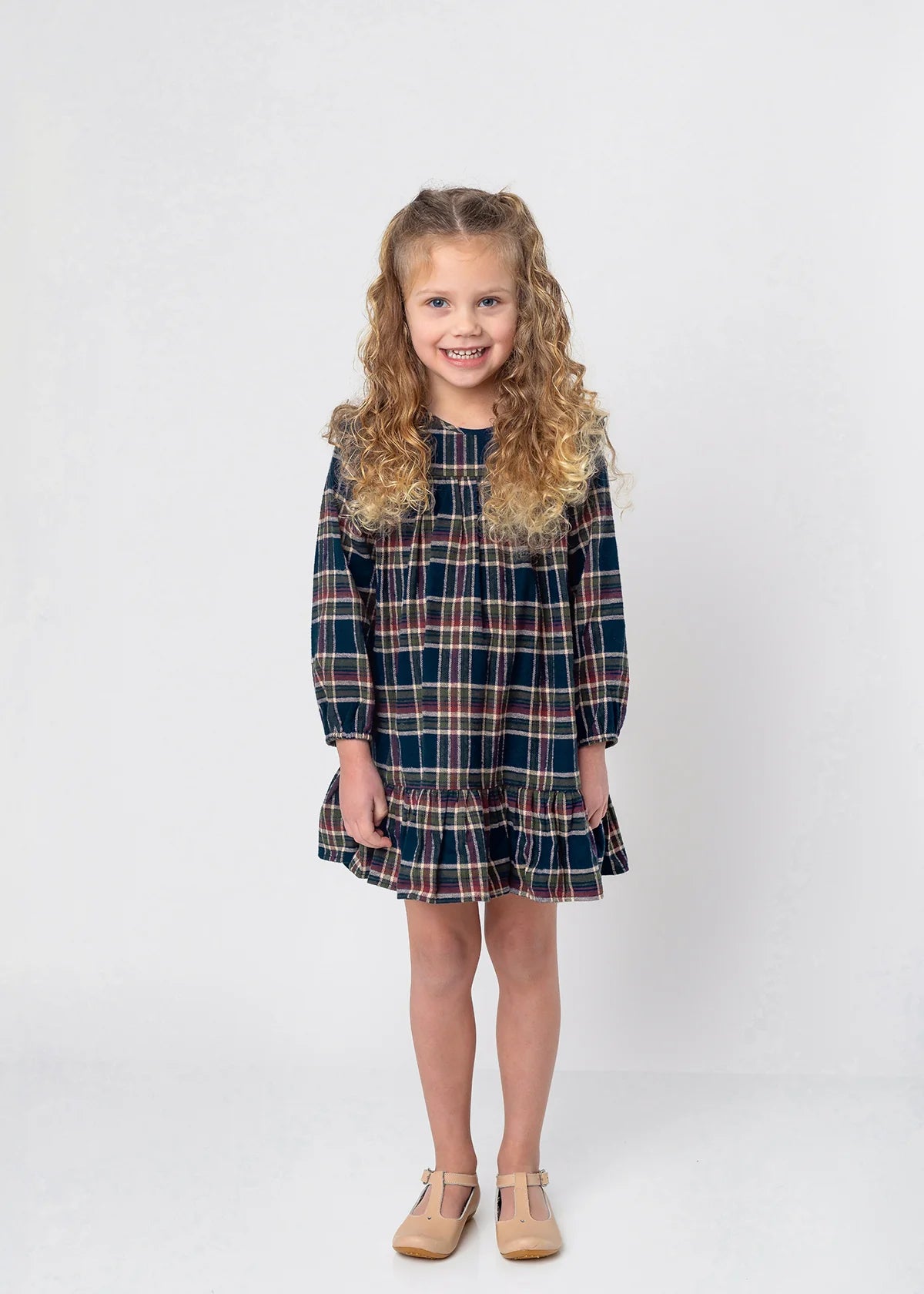 This adorable girl's dress showcases a timeless plaid pattern in deep navy, burgundy, and cream tones. Designed with long sleeves and ruffle details on the shoulders and hem, it offers both warmth and style. The gathered waist creates a flattering silhouette, making it perfect for both casual outings and holiday gatherings. The soft, breathable fabric ensures comfort throughout the day, making it a versatile addition to any little girl's wardrobe.