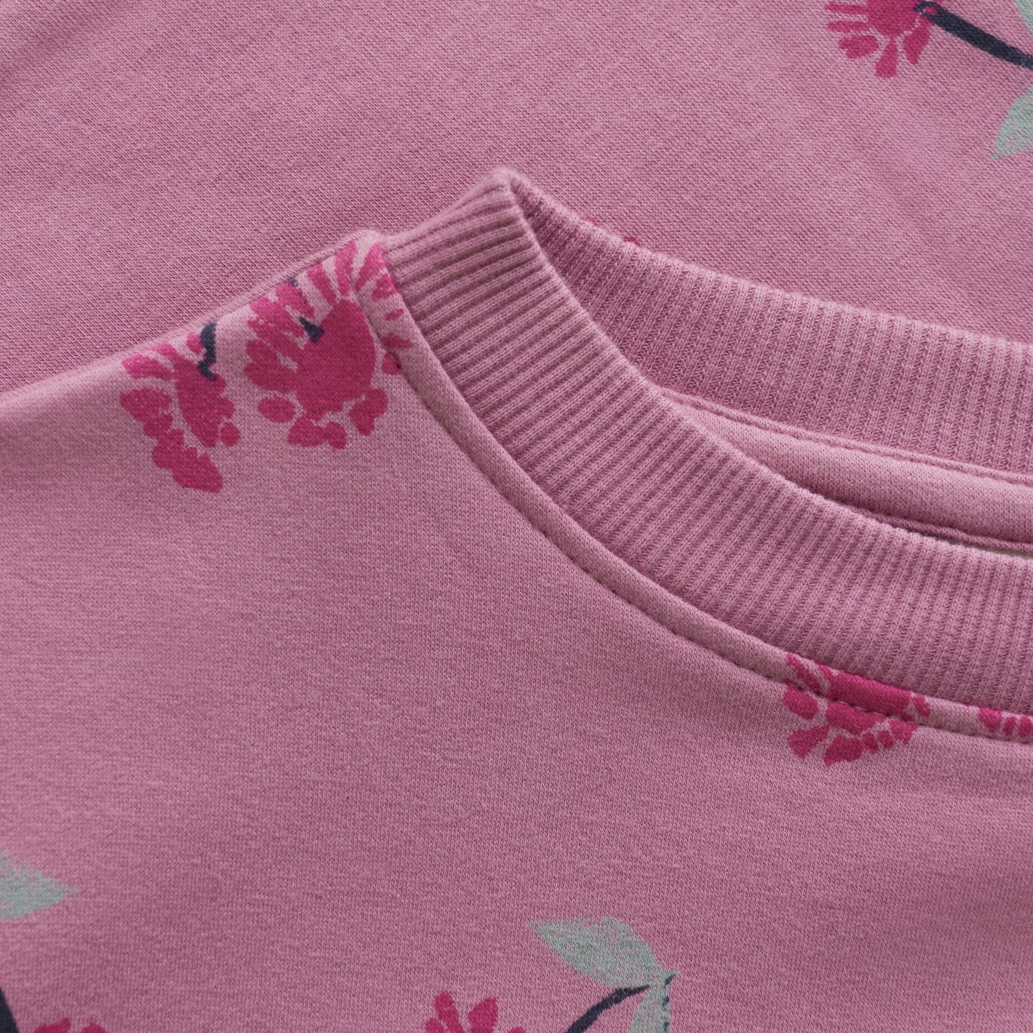 Mauve sweatshirt with berry design and ruffle detailing on the hem.