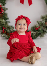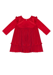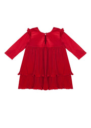 Celebrate the season in the Merry 'n' Bright Dress, a stunning red velvet creation. This dress features playful ruffled shoulders and layered pleated satin skirt that twirls delightfully. Its rich, vibrant red shade makes it an ideal choice for holiday photos or festive gatherings.