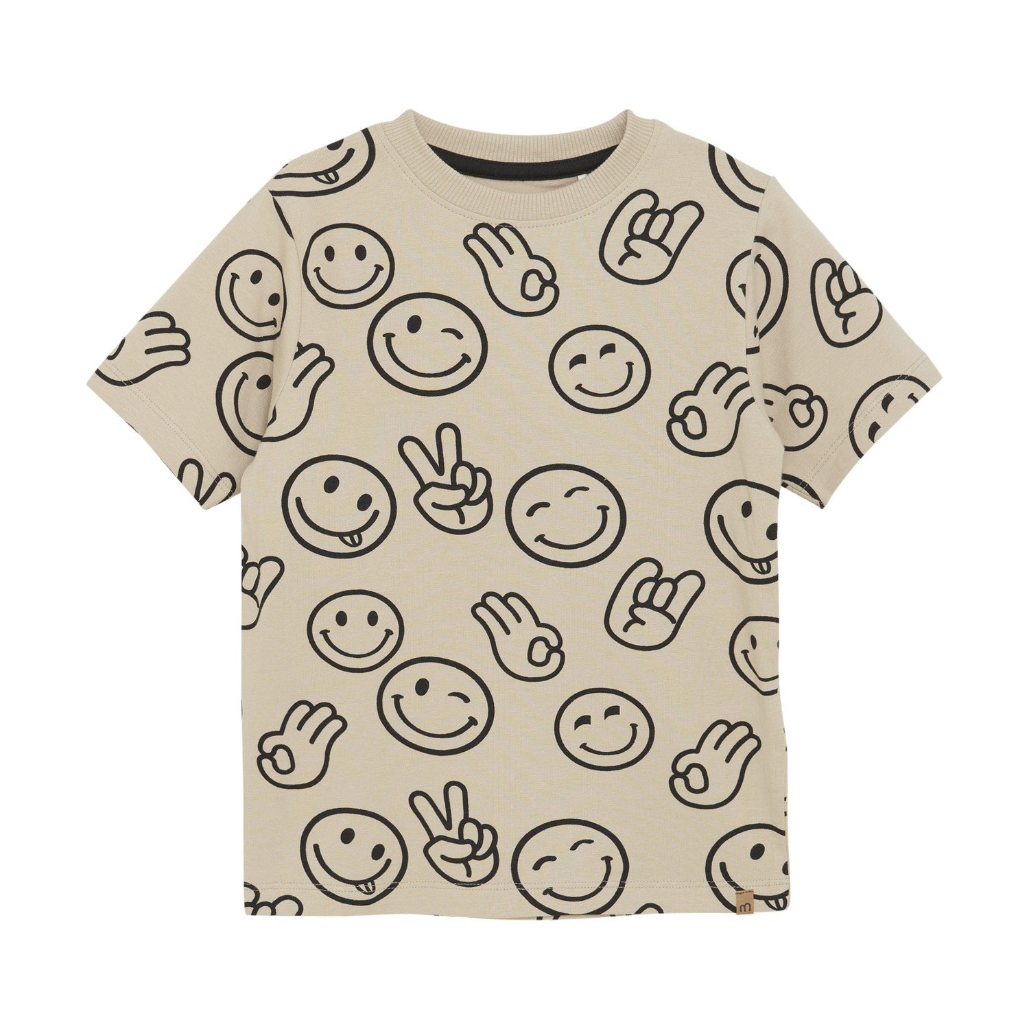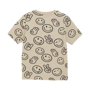 Tan tee with fun emote graphics. Pair with colored bottoms for a fun outfit.