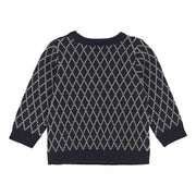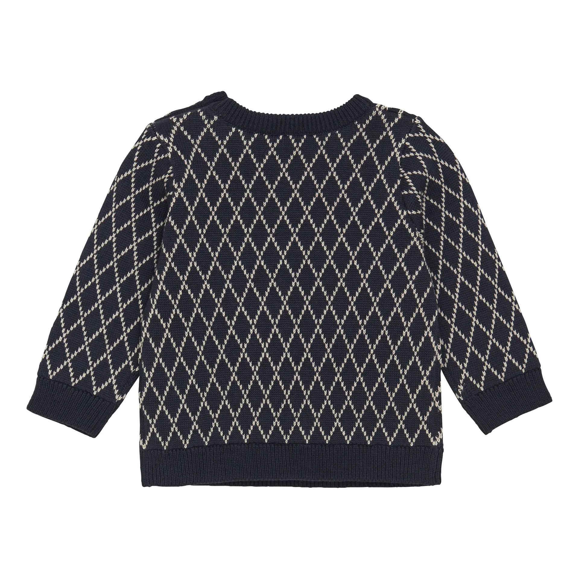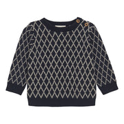 Nice knitted sweater from Minymo. The sweater is made of 100% organic cotton. The shirt has a nice pattern and closes with two buttons on the shoulder. Certified acc. to GOTS - organic CERES-0366.