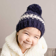 For your little rebel, this indigo blue hand-knit beanie had a natural intarsia stripe. It's trimmed with a matching yarn pom pom. Hand knit in cozy, thick acrylic yarn, this hat is sure to bring smiles and makes a great gift. 100% Acrylic. Cold handwash. Hand knit in China.