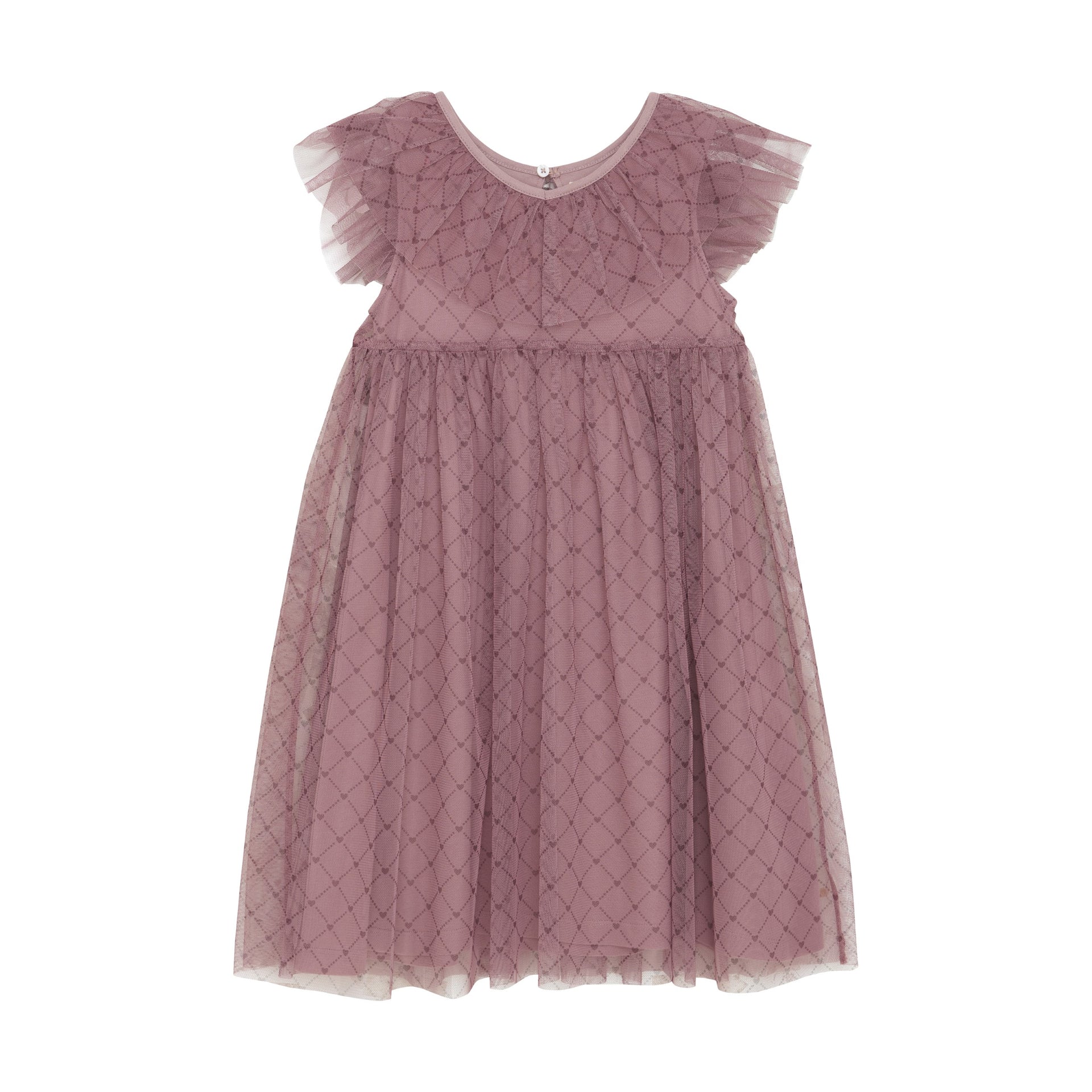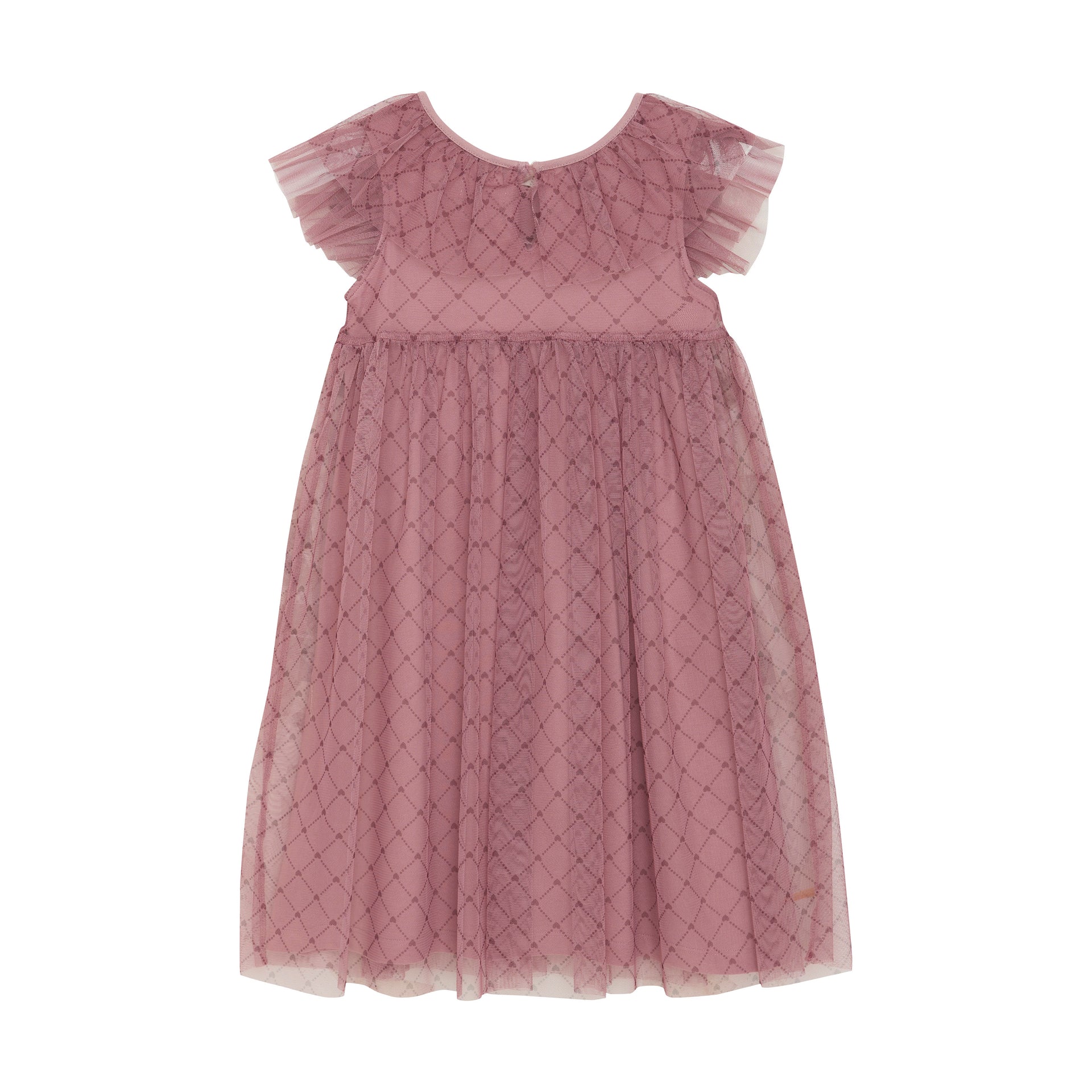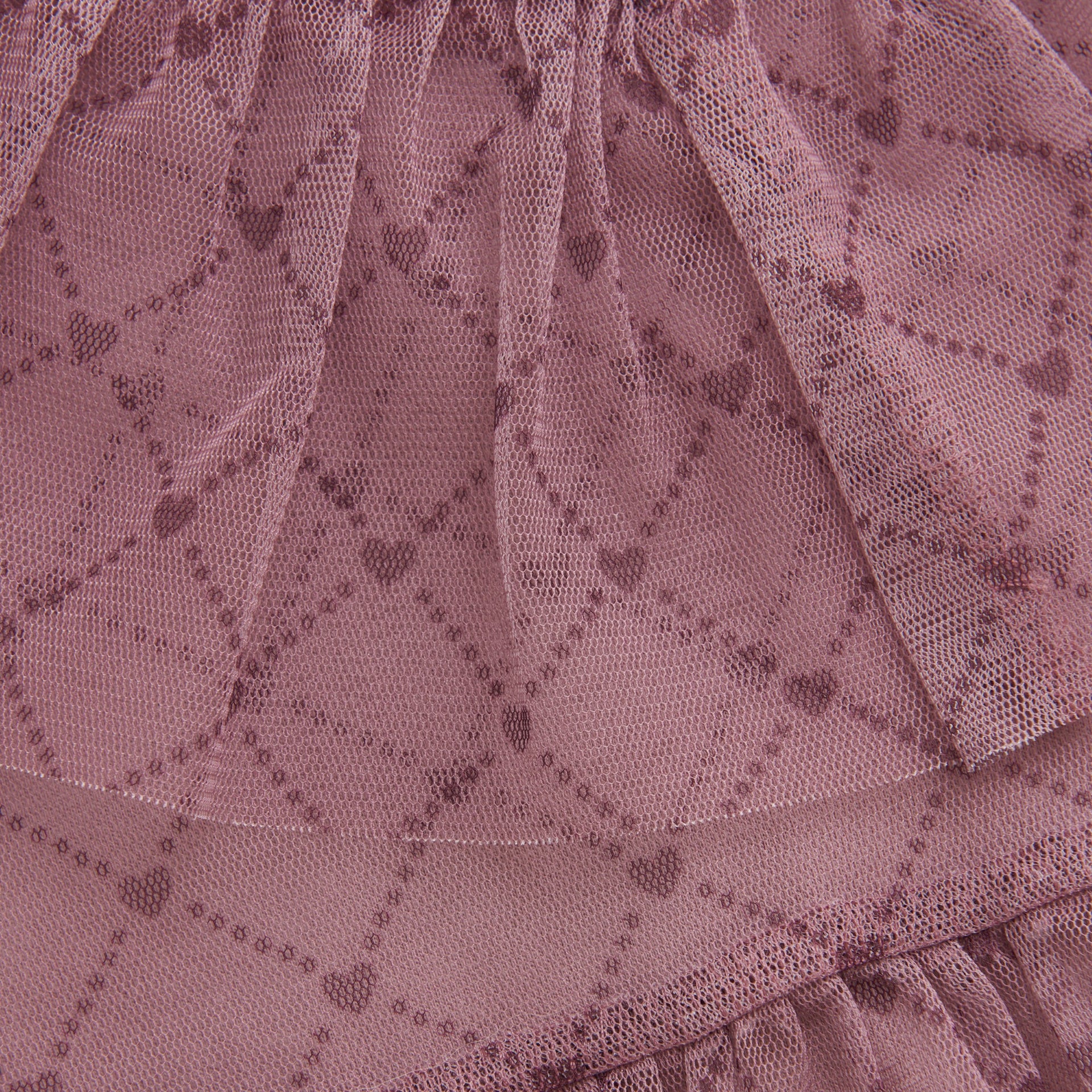 Mauve tulle dress with heart accents. Add a maroon sweater and tights for a monochromatic outfit or add black details for more of a neutral outfit.