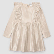 A little shimmer goes a long way to making every day feel like a special occasion. This gold, lamé jersey dress lets her sparkle her way through the day and features a delicate ruffle trim down both sides to add even more fun. A button placket at the back makes the dressy fit easy to pull on and off as she wriggles or dances.