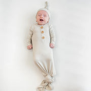 This all-in-one outfit is the softest newborn essential designed with both you and your baby in mind. Crafted from soft, stretchy ribbed bamboo, this gown features a tie bottom for easy diaper changes and comes with a knotted turban for the finishing touch to a classic look.