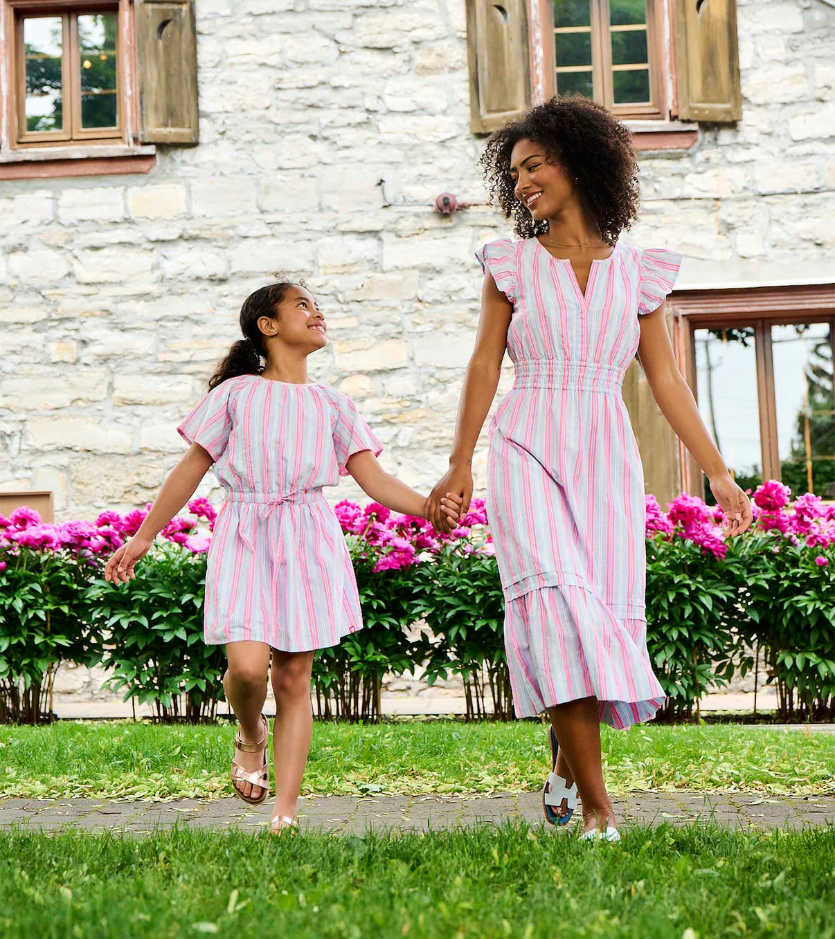 Bright neon stripes energize this breezy raglan dress with charming flutter sleeves. The adjustable drop-waist with drawstring allows for customizable fit and styling options. Comfortable lined bodice and skirt feel gentle against skin for all-day wear. Pretty gathered details at bodice and sleeves add feminine charm to the playful design. Perfect for girls who want vibrant style that keeps up with active days.