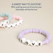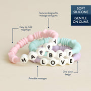 A Sweet Way to Soothe! It’s friendly vibes all day long with these 100% silicone teething rings! Bitzy Bands are easy to grab, soft to chew, and designed to massage sore gums. With soothing textures all around, your little bestie will feel the love. Welcome to the teething era!