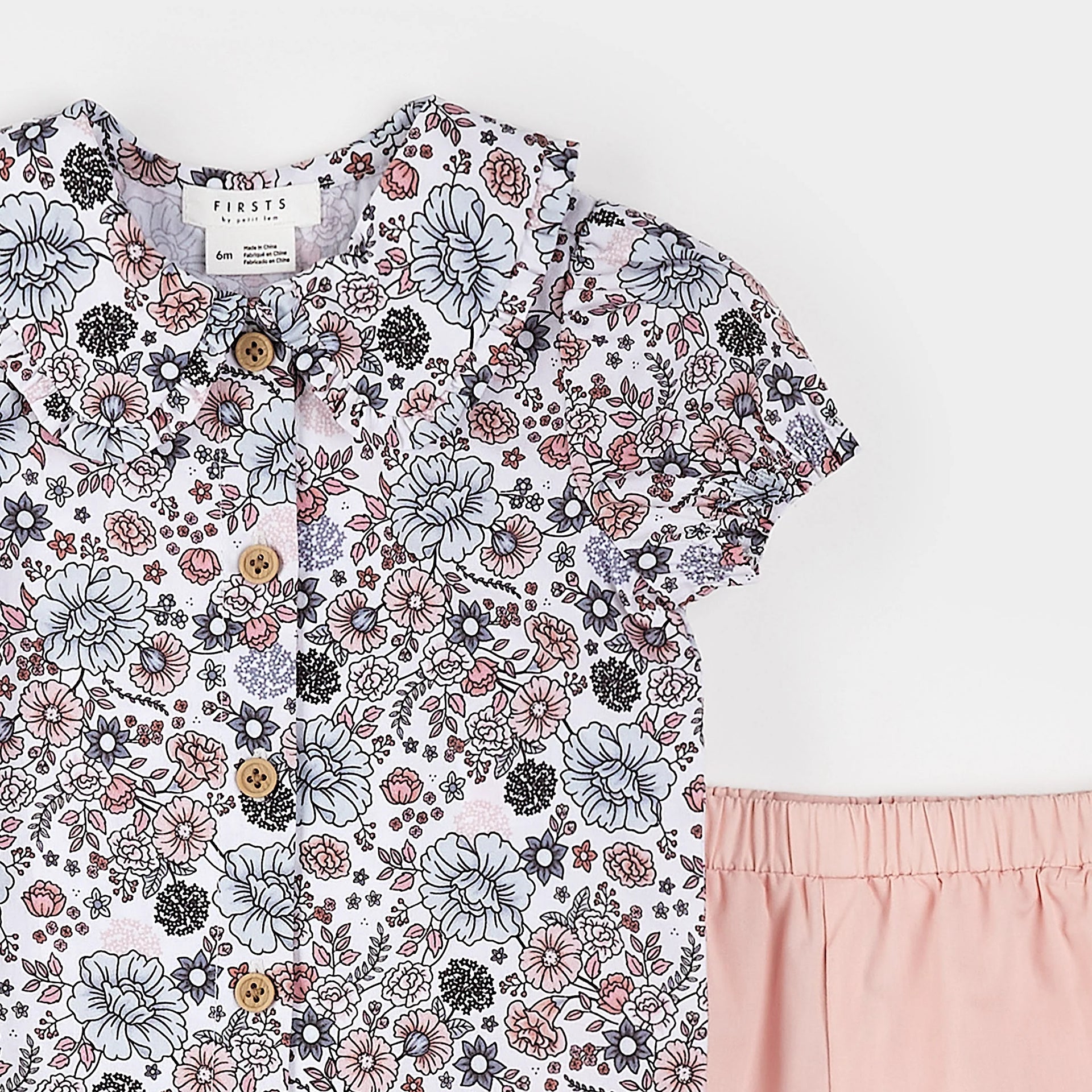 Perfect for tea-parties and picnics, this floral outfit set features a vintage-style shirt with puffed sleeves, a Peter-Pan collar and coordinating pink frilly shorts. With an elasticated waistband, the shorts are easy to pull up and down, encouraging independent dressing, and making diaper changes on the go quick and easy. There’s a matching hat available in the same range, ensuring she looks as cute-as-a-button while being shaded from the sun.