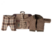Jacket, pants and tie in suitcase, Grandpa mouse