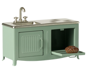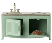 The heart of every home is the kitchen. This metal kitchen has a beautiful color tone and has many playful details such as a cabinet door, sink and an oven with a freshly baked pie. It is a perfect size for the mouse family.