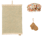 The wellness set comes with a towel, a bathing hat and a bath mitten. The hat and glove fits the Maileg bunnies size 1 & 2 and Teddy family.