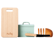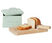 This miniature playset consists of a bread box, half bread and 3 slices, a cutting board, and a knife. It is made of metal, wood, and polyresin. It is the perfect start of a play in the miniature kitchen.