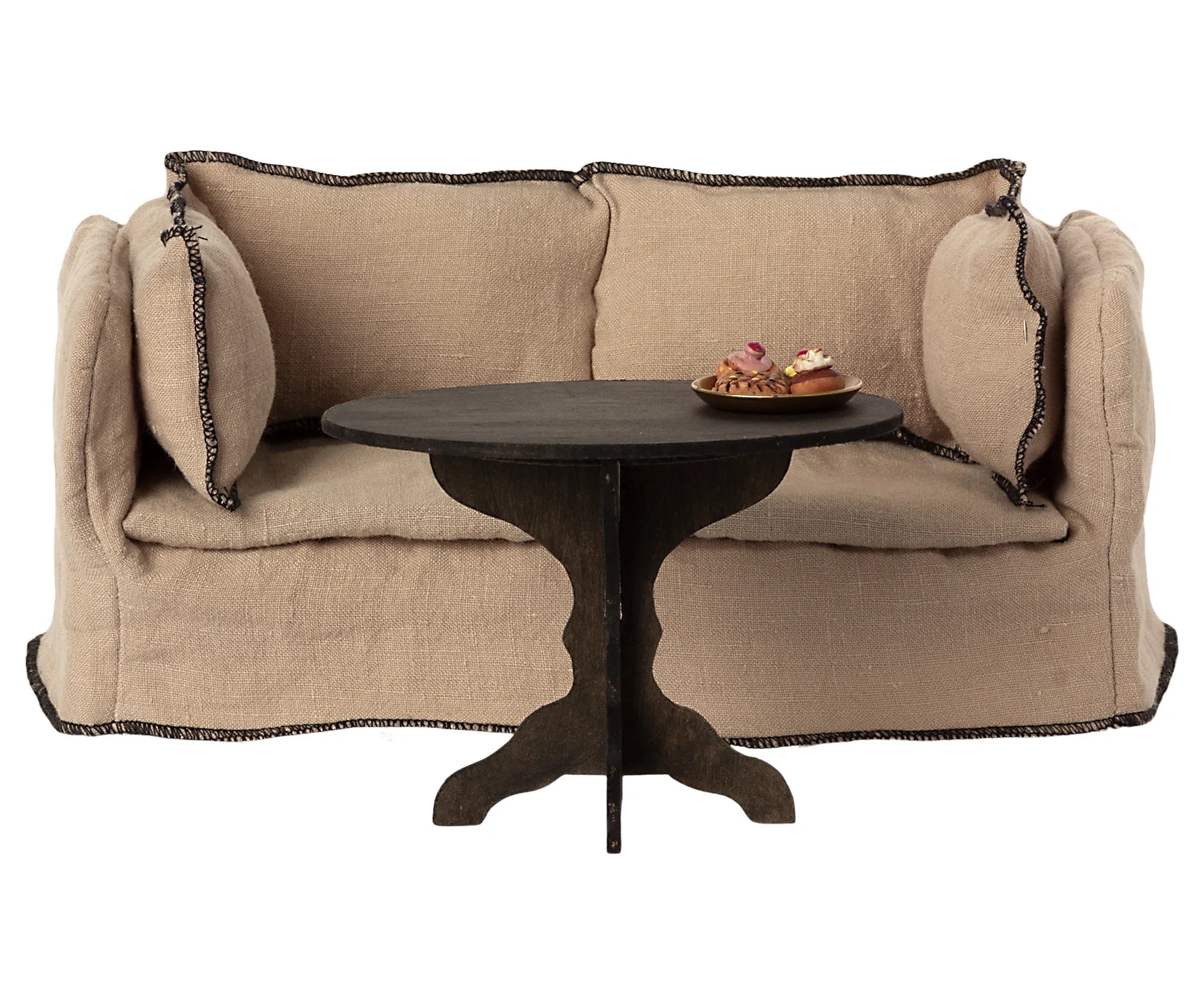 Coffee table made of FSC wood and painted in anthracite color. It fits perfectly together with the couch and into the Maileg dollhouse. The table is delivered flat packed and is easily assembled so the play can soon begin.