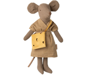Mum mouse in light brown body fabric. She wears a dress and a bag with cheese holes. This mouse fits furniture and accessories in size mouse. Buy more clothes separately, clothes in size mum/dad fits this mouse.