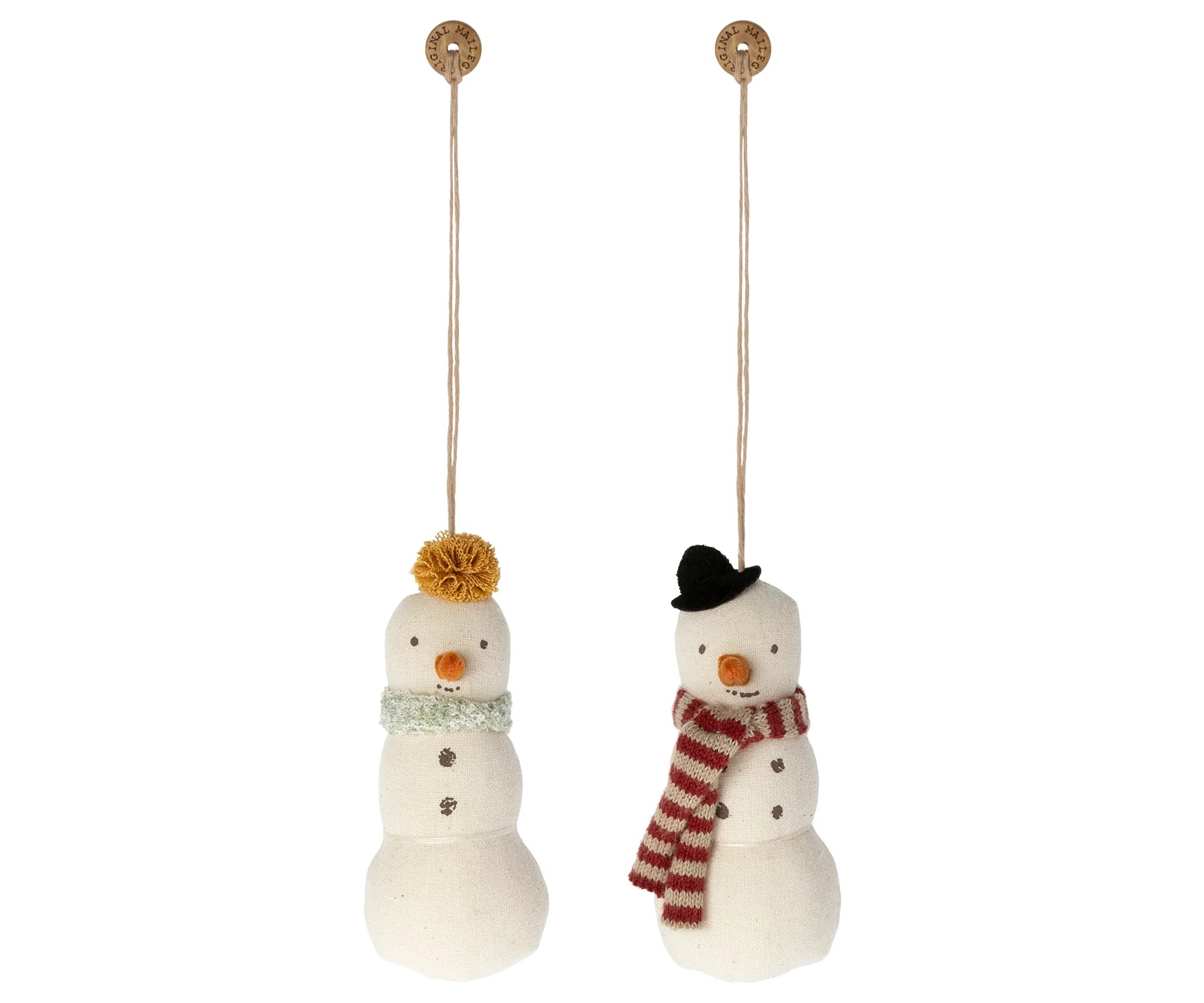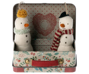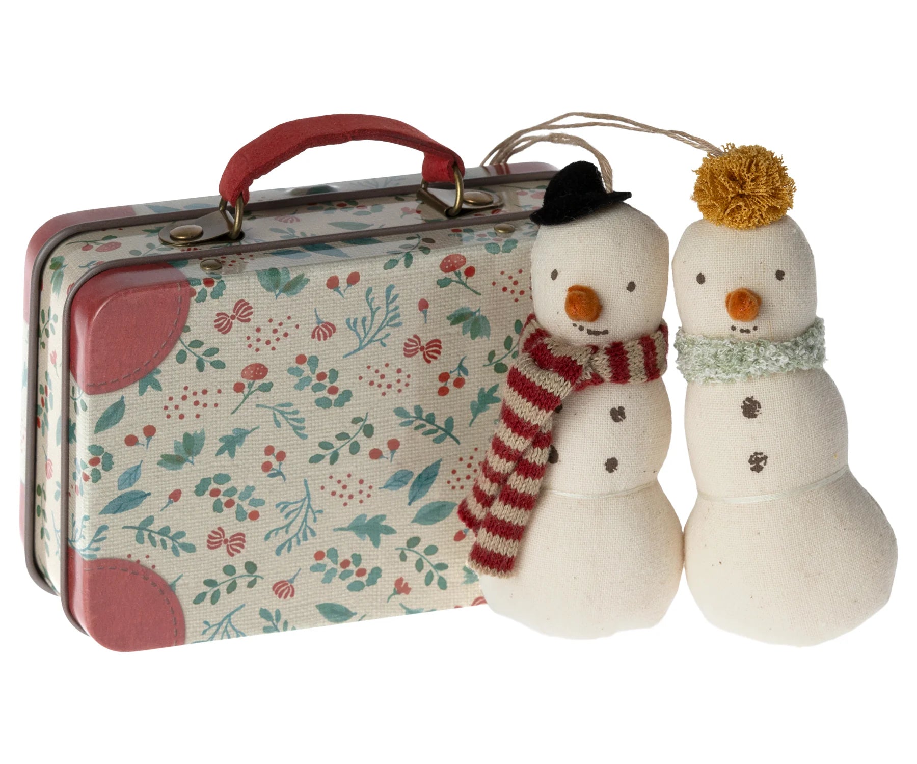 Maileg snowman ornaments in a holiday decorated suitcase.