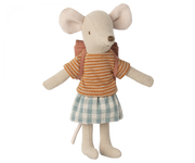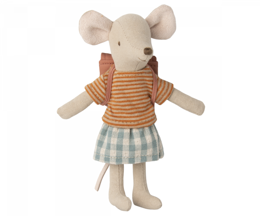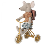 A big sister mouse is dressed for a day in kindergarten or school as she is bringing her backpack. She has magnets in her hands so she can hold the tricycle handles tight for the fast trip.